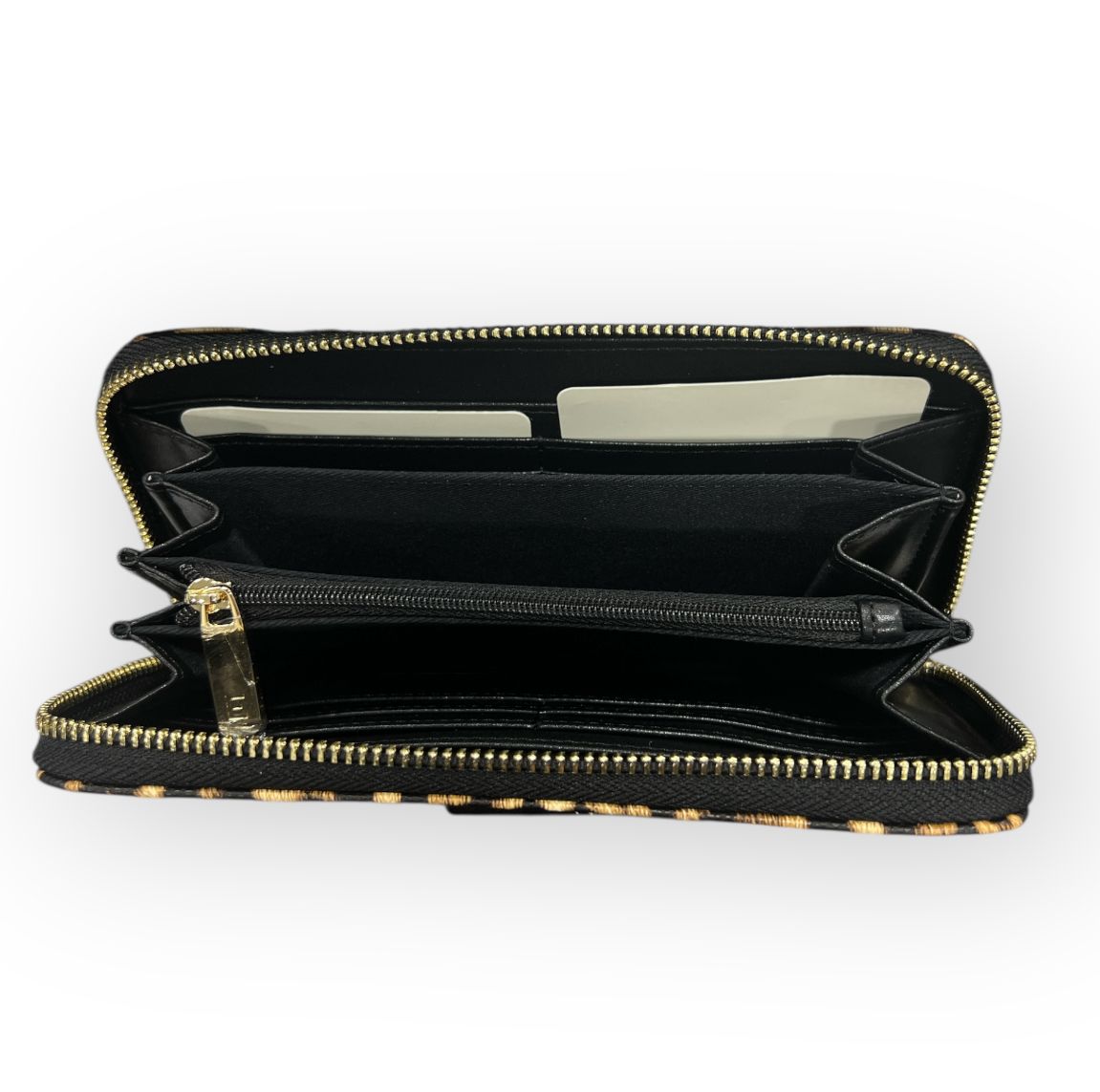 vari scomparti interni per riporre carte, documenti banconote e scomparto con zip per le monete