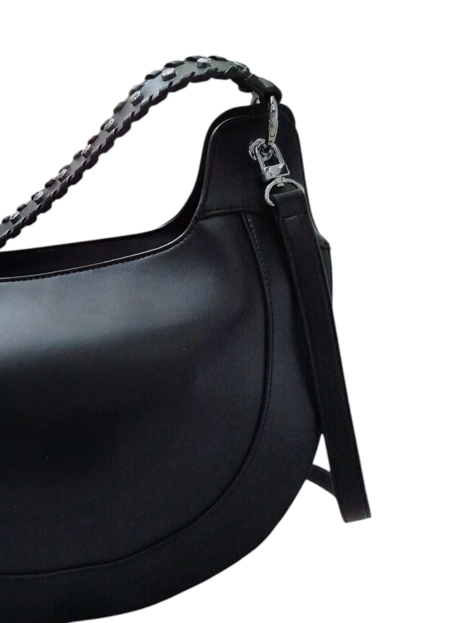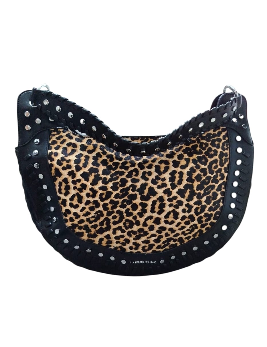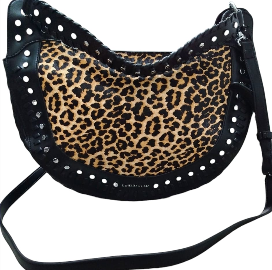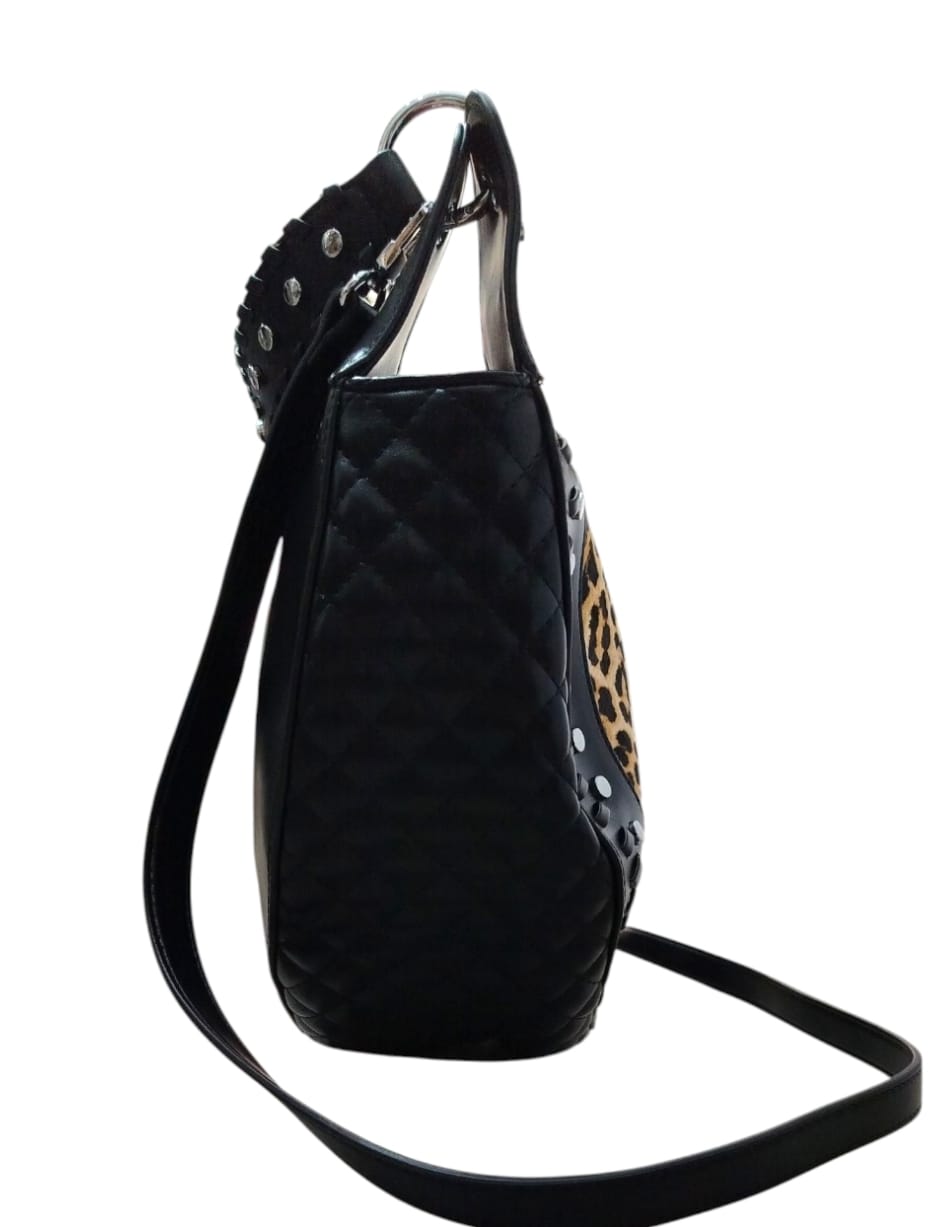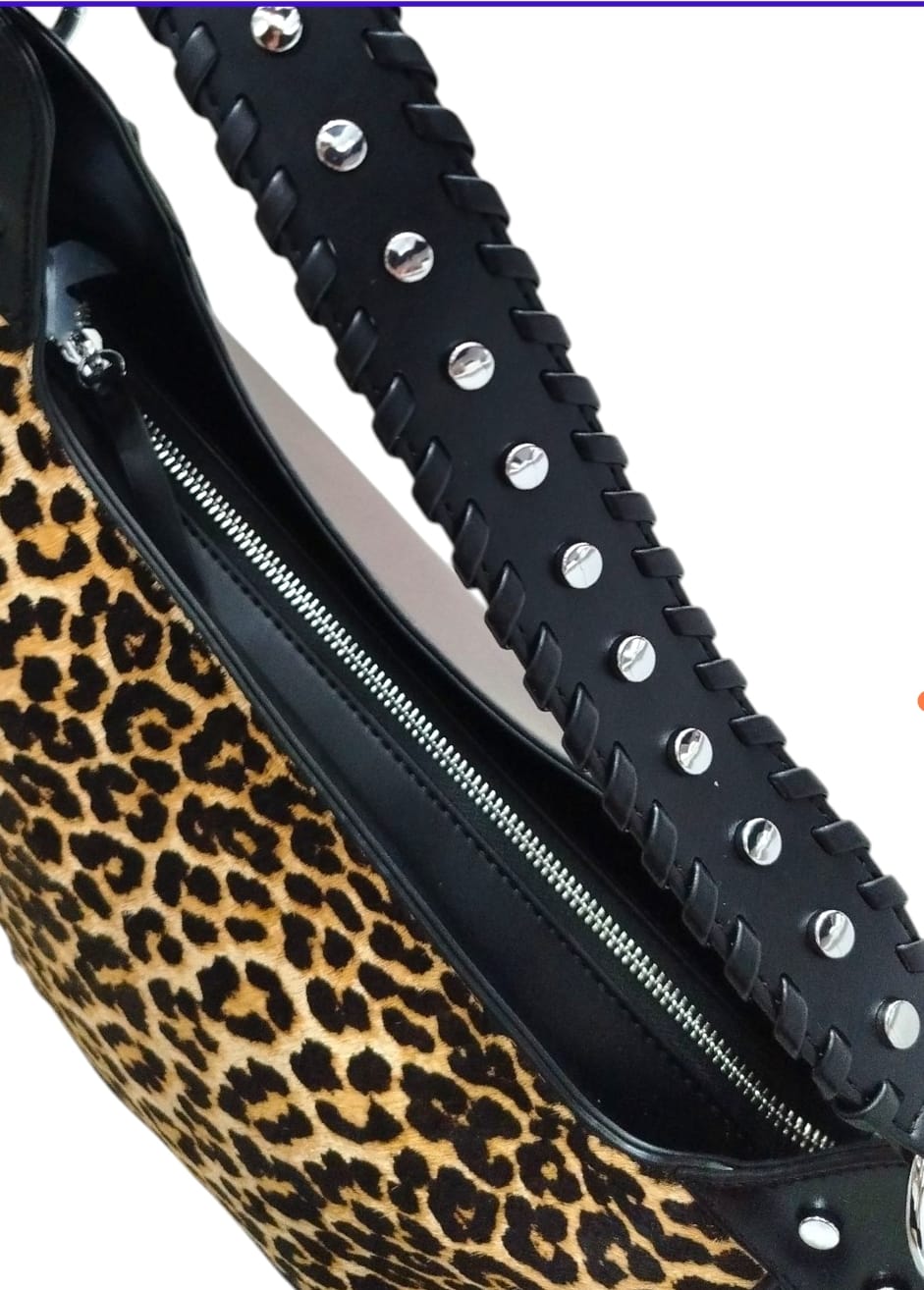 Modello: borsa a spalla;Materiale: ecopelle;Colore: nero con decorazioni maculato di cavallino marrone;Interno: tessuto;Dettagli: 3 taschini (1 con zip);Chiusura: zip;Dimensioni: 39x26x11...