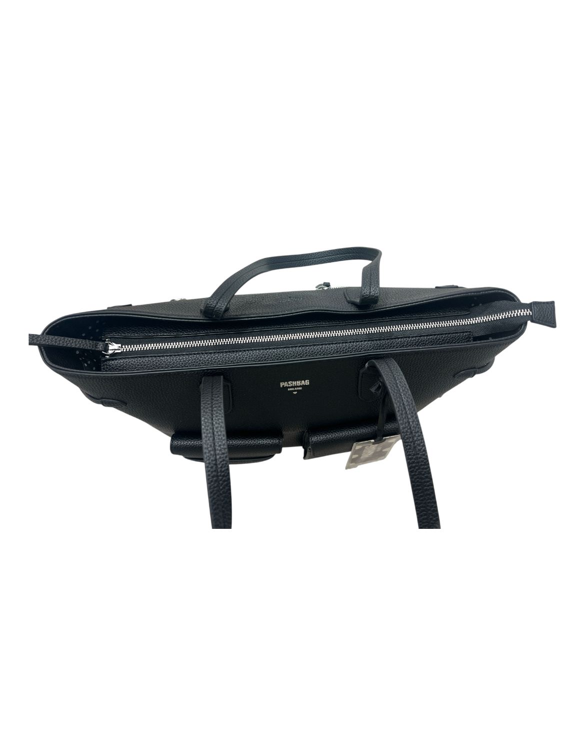 Capiente borsa shopper in ecopelle martellata nera con doppio manico lungo. Dotata di due tasche frontali applicate con pattina e bottone, e tasca posteriore con zip per massima praticità. Interno ampio, chiusura superiore con zip e finiture metalliche silver. Logo PashBag Milano frontale.