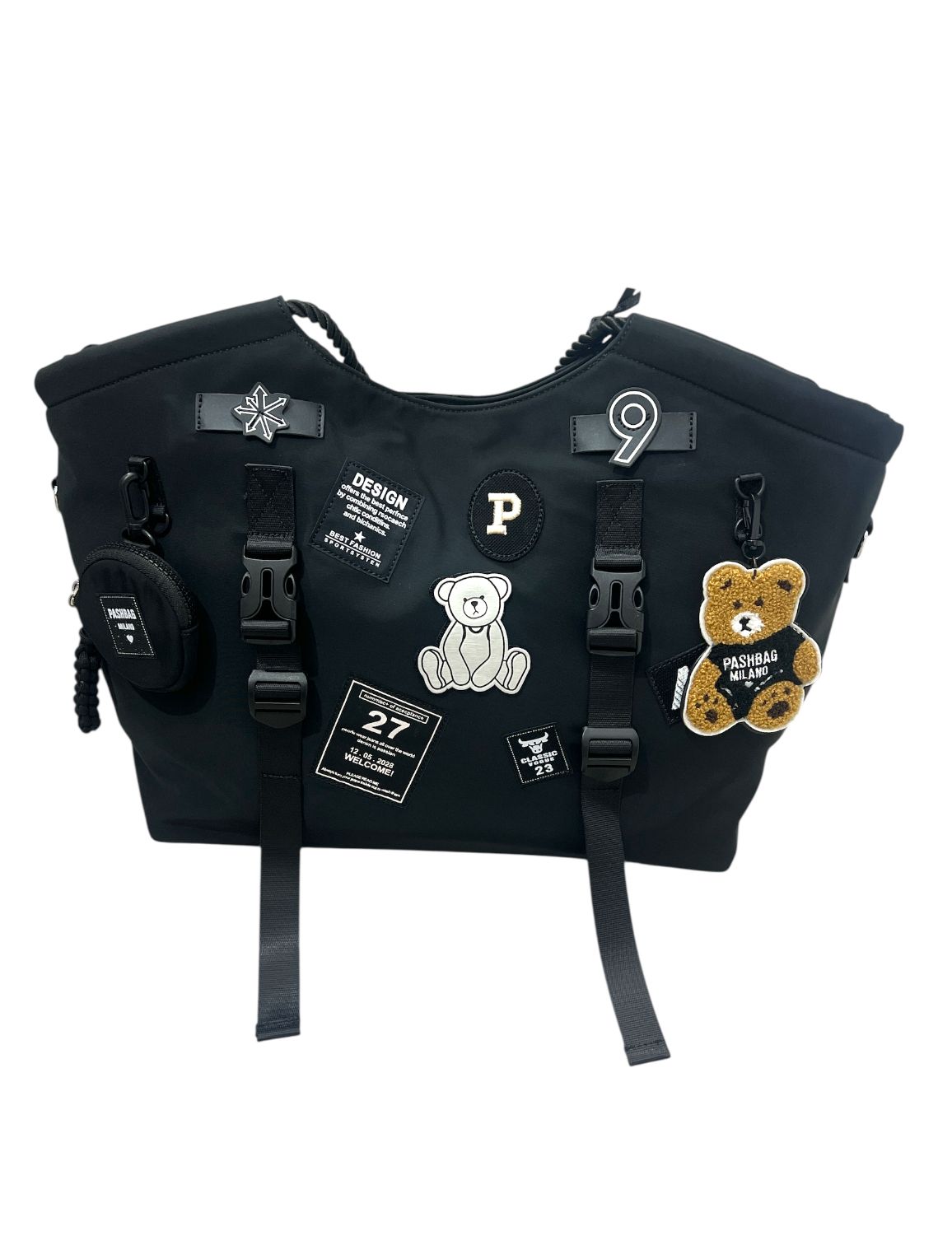Borsa shopper in tessuto tecnico nero, leggera e capiente, perfetta per l’uso quotidiano. Manici in corda intrecciata, chiusura superiore con zip e tasca posteriore esterna con zip. Design morbido e funzionale.
