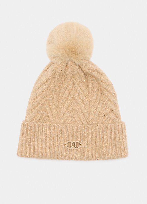 Cappello a cuffia beigeMateriale: jersey elasticizzato semi-lanaFiniture in Lurex®PomponRevers a costineLogo metallico