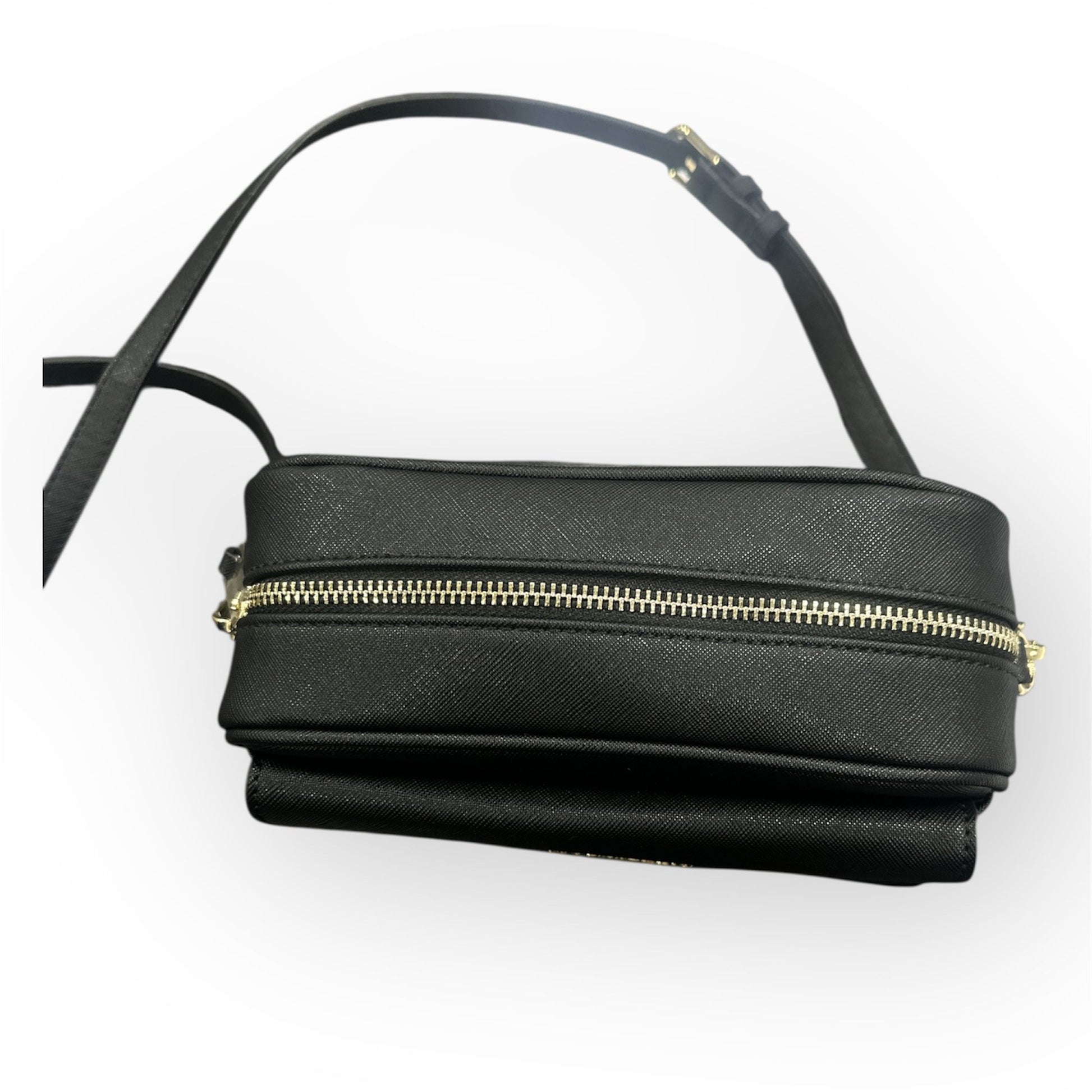 ha una cerniera dorata che la chiude e una tracolla sottile regolabile perfetta per indossarla a spalla o crossbody.