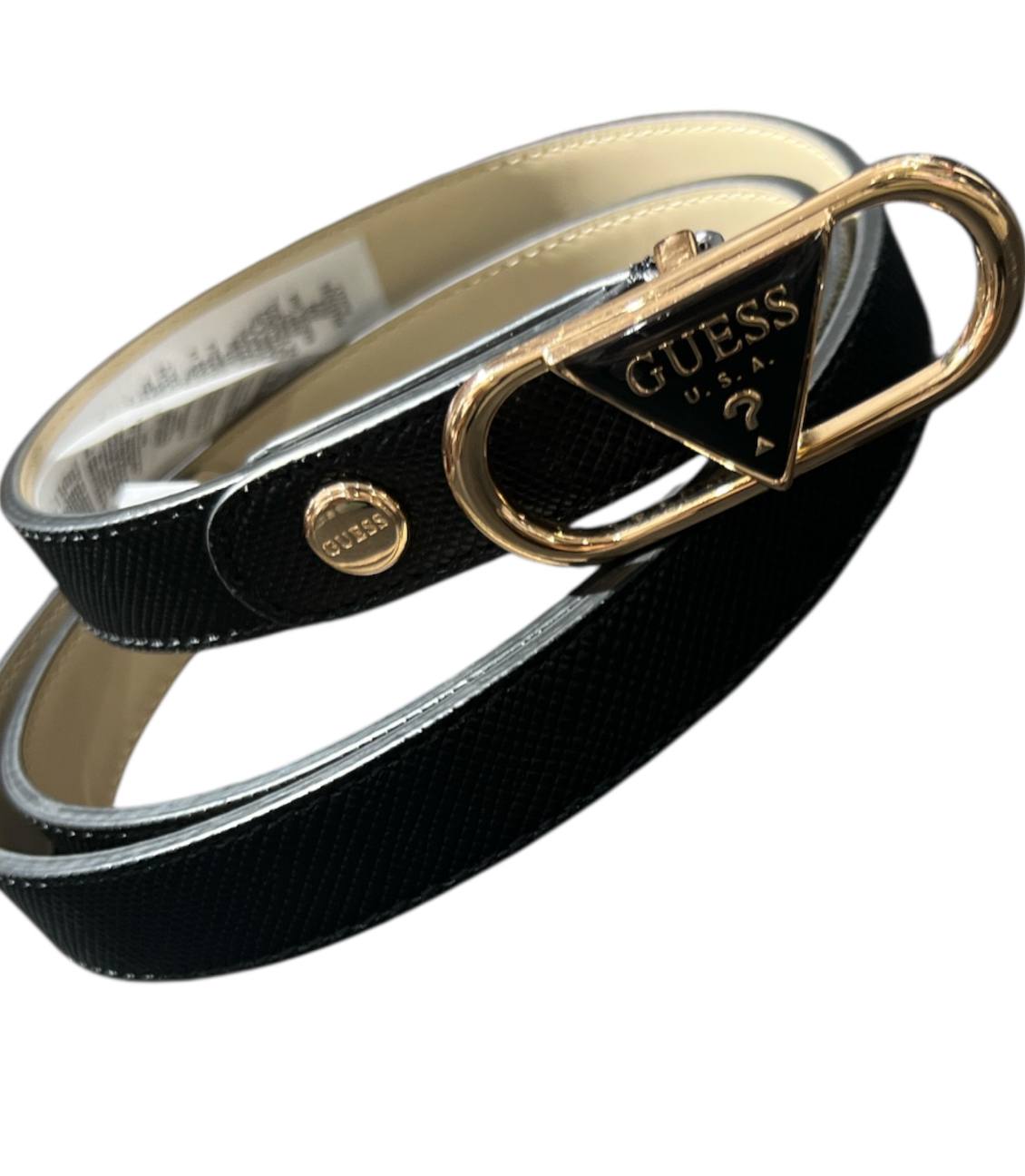 La cintura GUESS Rosalba Saffiano è l'accessorio ideale per aggiungere un tocco di eleganza e stile al tuo outfit. La sua finitura Saffiano conferisce un aspetto sofisticato e resistente, mentre la fibbia triangolare con il logo Guess in metallo color oro pallido aggiunge un dettaglio distintivo. Perfetta per essere indossata in vita, questa cintura si adatta sia a look casual che formali, valorizzando ogni tuo abbinamento.