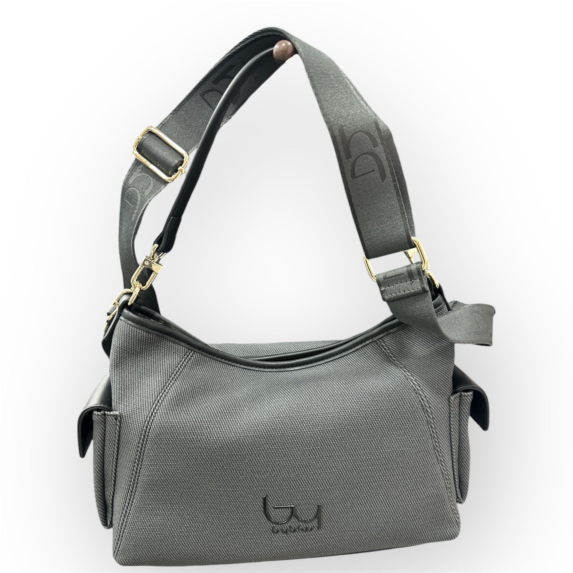 borsa byblos realizzata in tessuto fornita di due tracolle una per poterla portare a spalla e un'altra per poterla portare a tracolla loggata in tessuto.