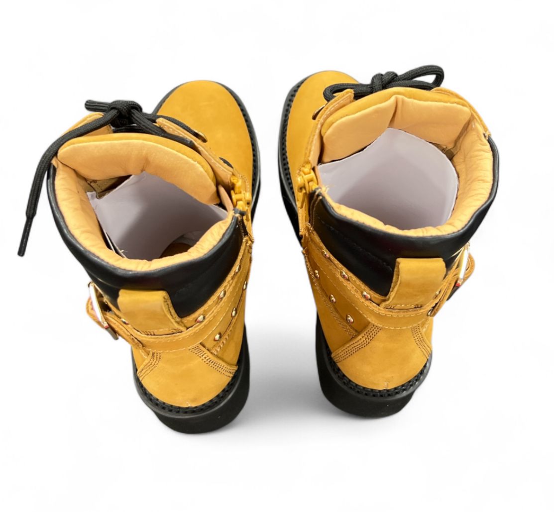 Numerosi borchietti dorati (piccoli rivetti decorativi) applicati lungo il gambale laterale e probabilmente anche davanti.