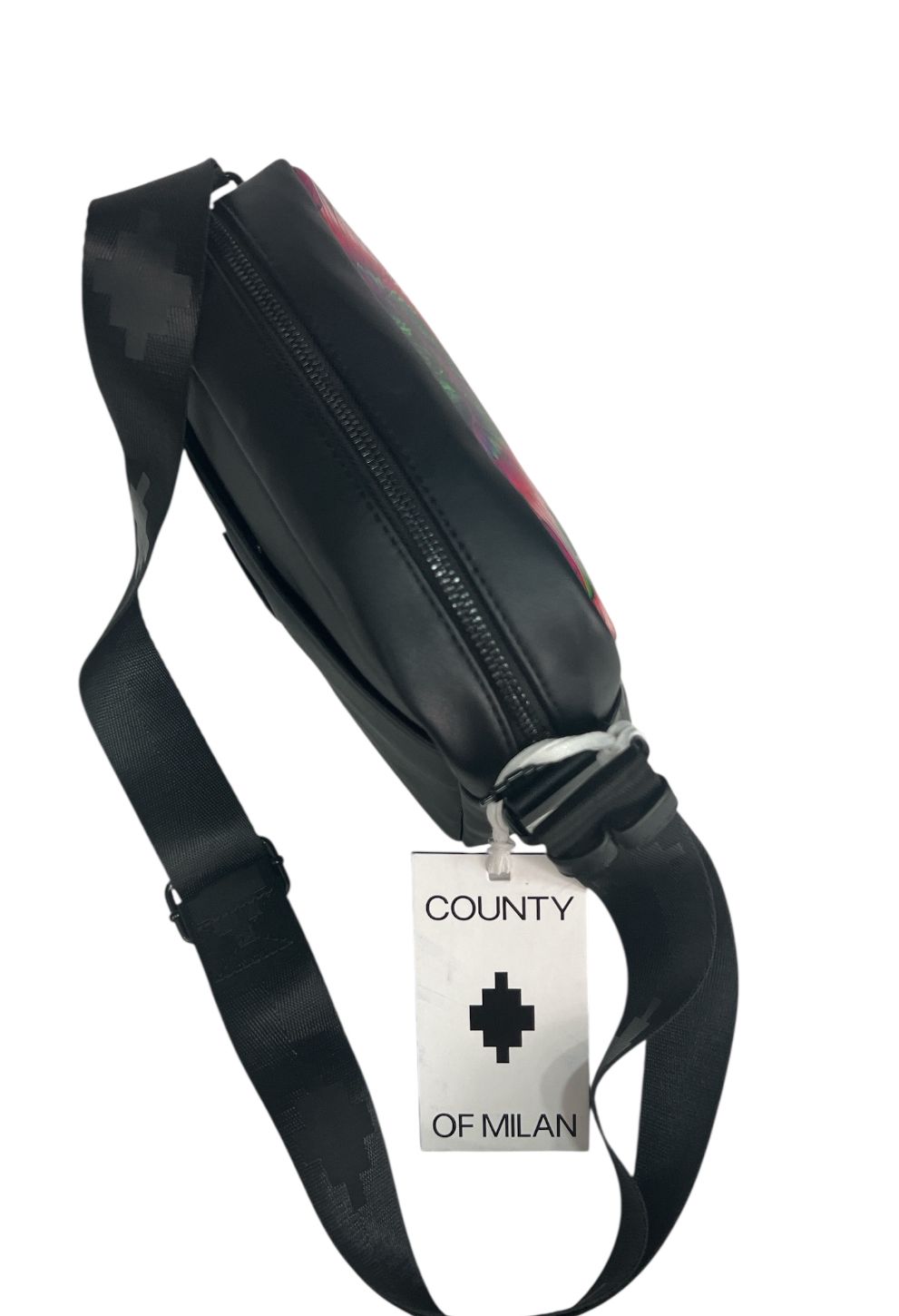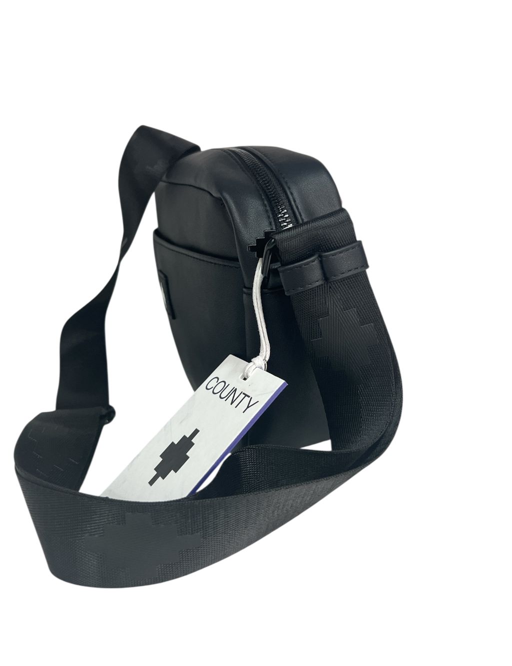 Borsello marcelo burlon in ecopelle nero apertura con zip nera molto capiente all'interno nella parte frontale troviamo lo stemma iconico...