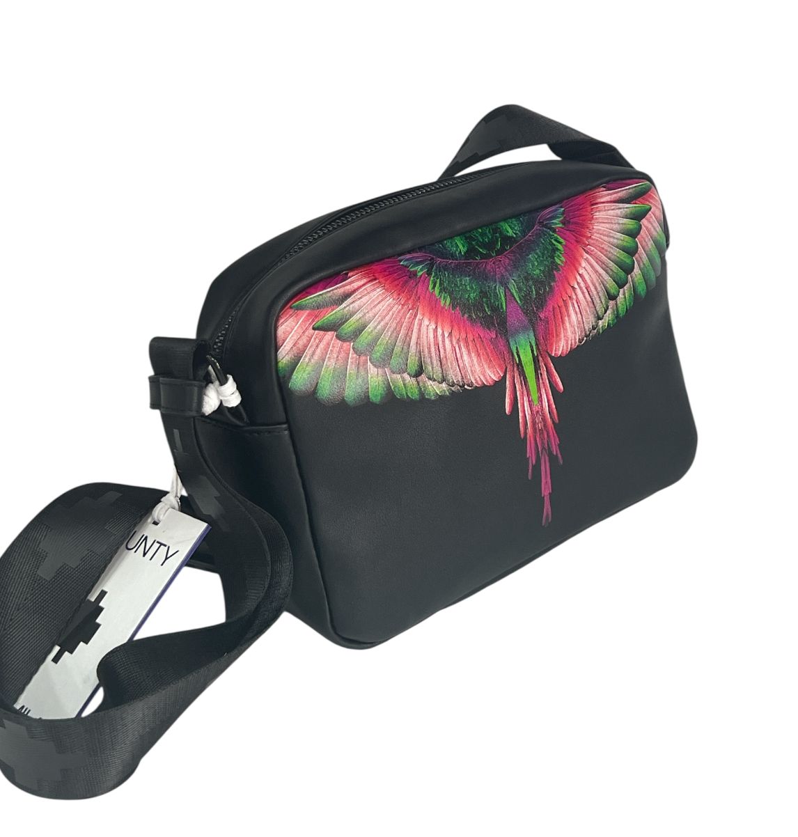 Borsello marcelo burlon in ecopelle nero apertura con zip nera molto capiente all'interno nella parte frontale troviamo lo stemma iconico del aquila che riconduce al brand fornita anche di polsiera