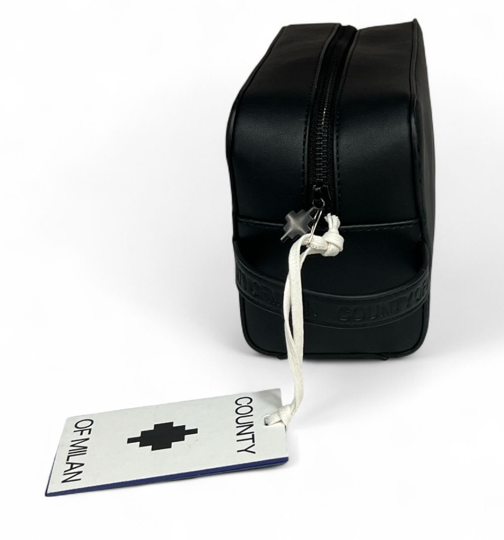 Borsello marcelo burlon in ecopelle nero apertura con zip nera molto capiente all'interno nella parte frontale troviamo lo stemma iconico che riconduce al brand fornita anche di polsiera