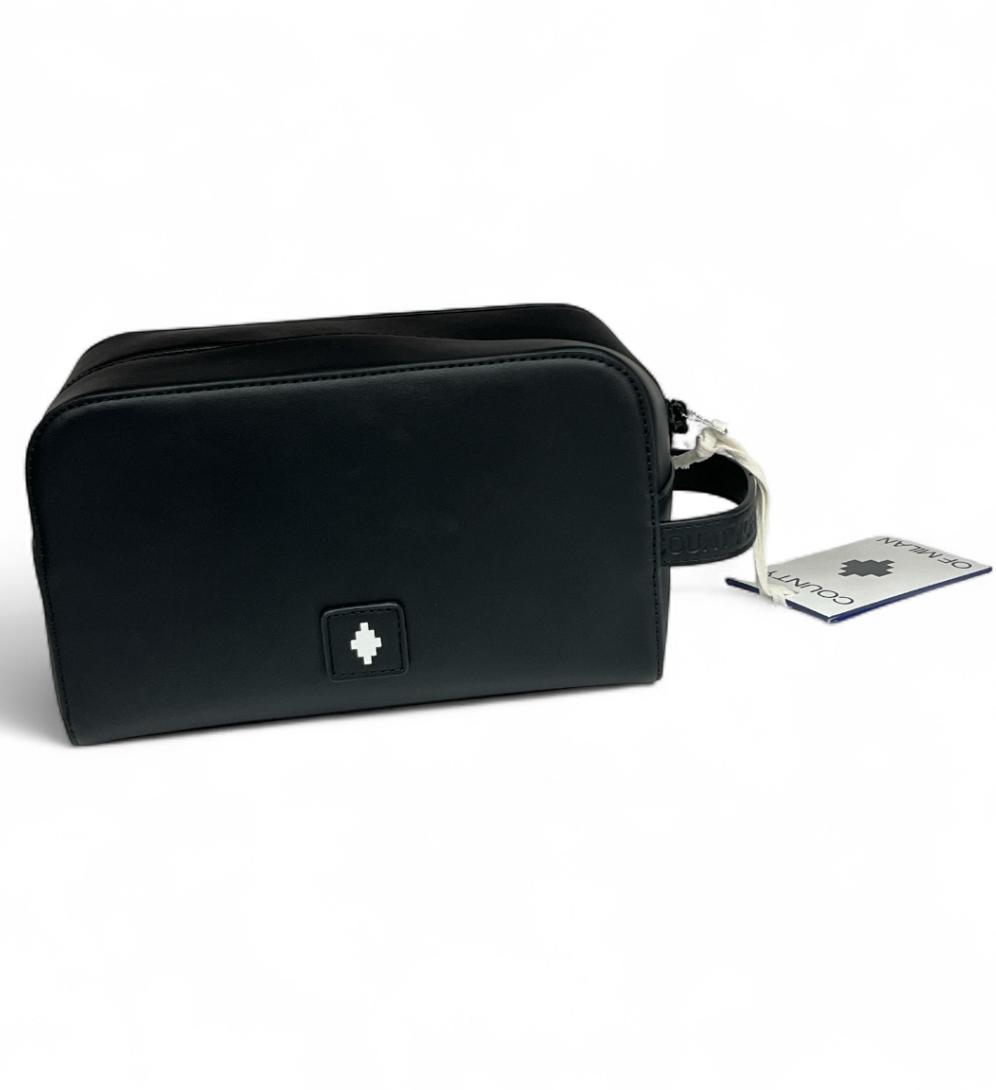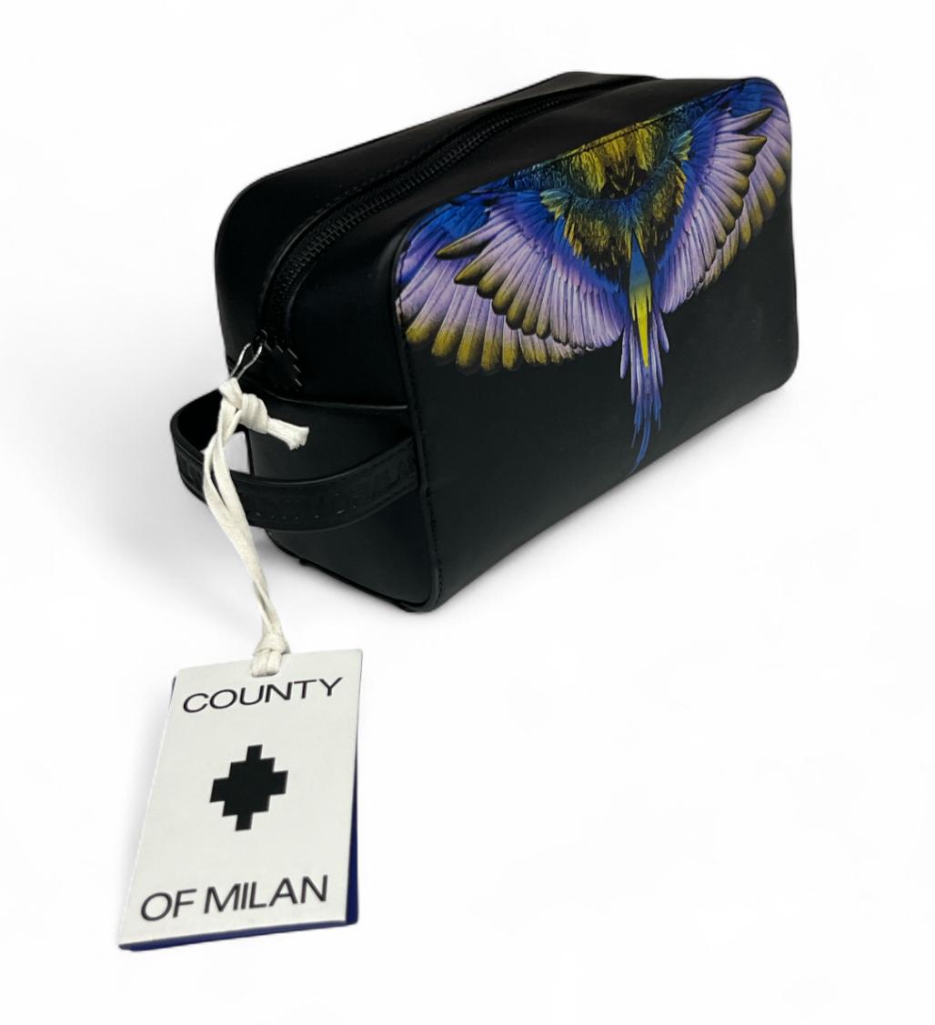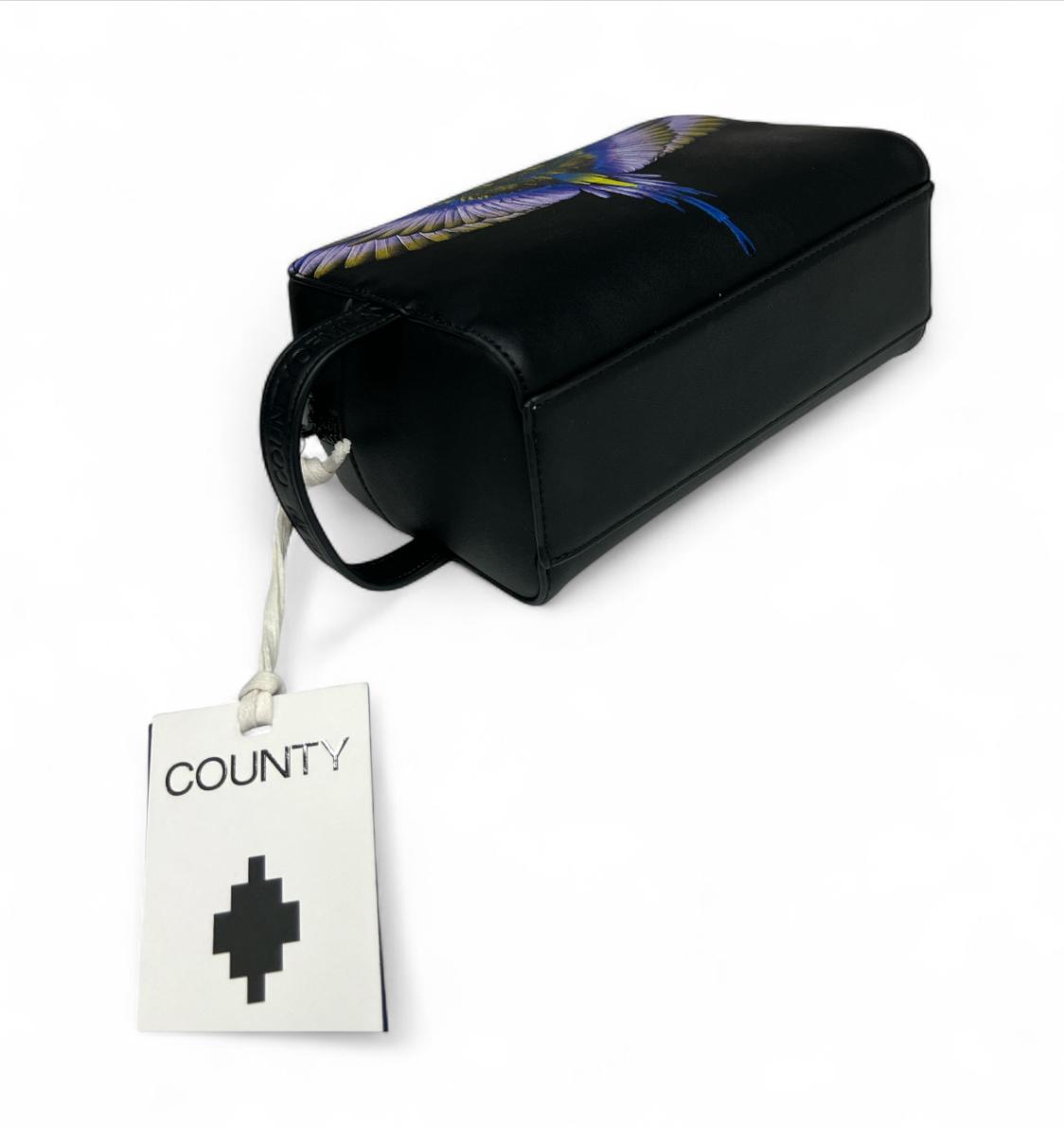 Borsello marcelo burlon in ecopelle nero apertura con zip nera molto capiente all'interno nella parte frontale troviamo lo stemma iconico del aquila che riconduce al brand fornita anche di polsiera