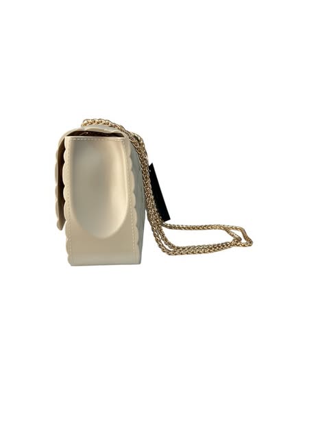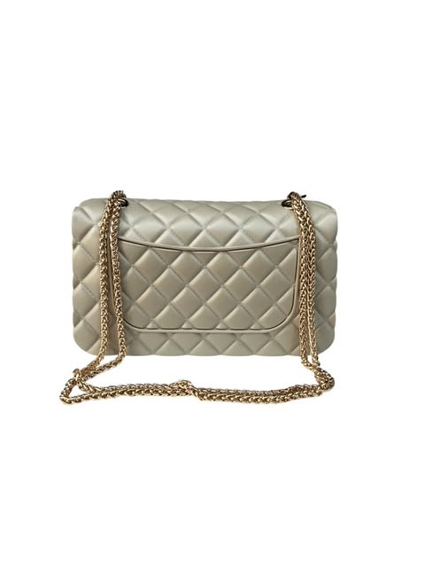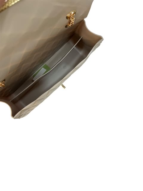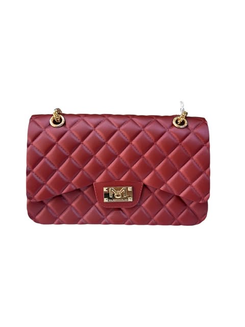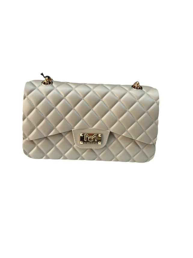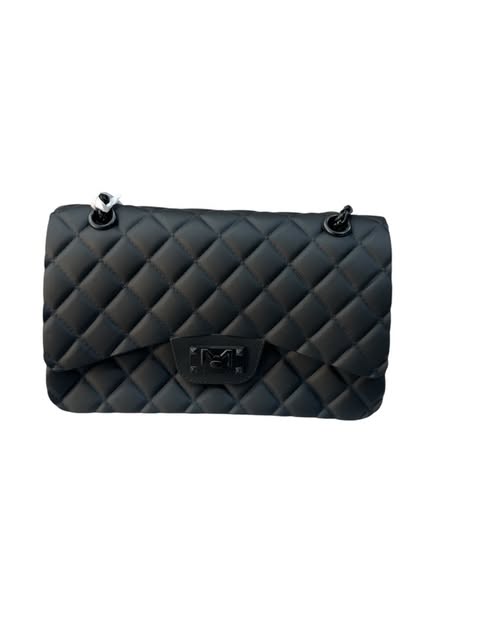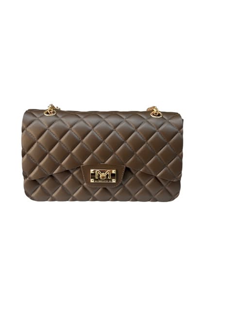 Questa elegante borsa a tracolla in gomma dal design trapuntato è perfetta per chi ama lo stile raffinato con un tocco moderno. Il modello presenta una silhouette compatta e strutturata, arricchita da una chiusura con patta e dettaglio metallico logato sulla parte frontale. La catena dorata aggiunge un tocco di lusso, permettendo di indossarla comodamente a spalla o a tracolla. L'interno spazioso è ideale per contenere gli essenziali, rendendola perfetta per ogni occasione, dal giorno alla sera. Un accessorio versatile e sofisticato che non passa inosservato. Dimensioni: larghezza 20,5cm, altezza 12cm, profondità 6,5cm.