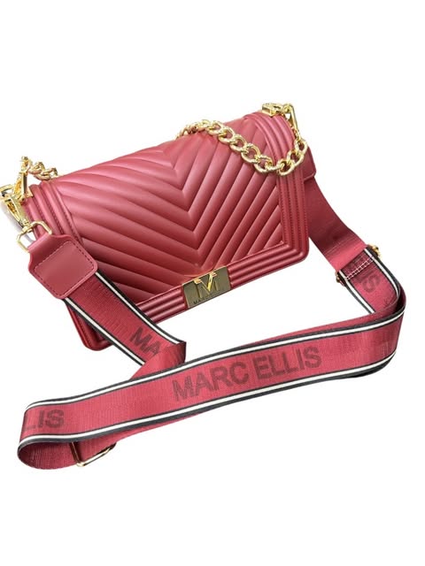 • Tracolla: in catena dorata intrecciata a spalla + tracolla in tessuto regolabile visibile nella parte superiore.