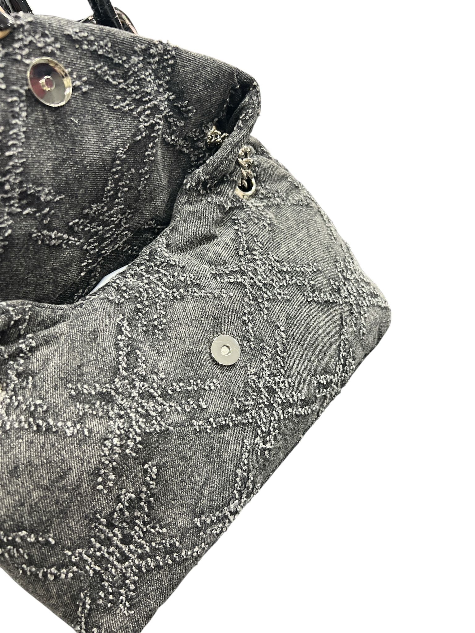 Regular shoulder strap denim sfrangiato nero, doppia catena argento, patta con logo sul davanti.