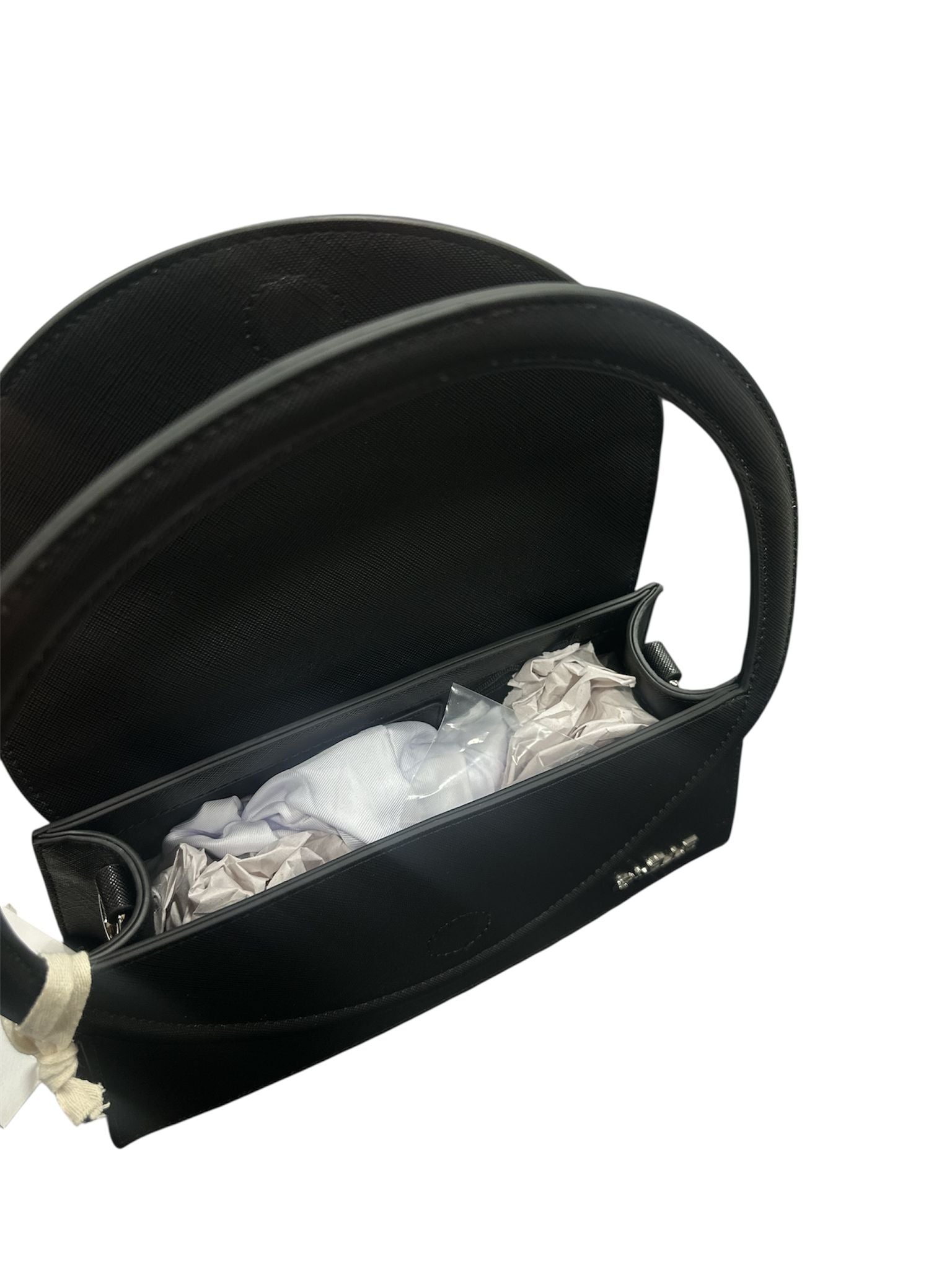 hand bag design saffiano con manico rigido.fornita anche di tracolla in ecopelle regolabile con rifiniture in argento .apertura con patta...