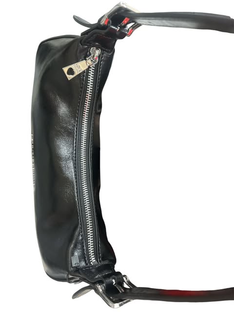Borsa nera a spalla love moschino in pelle lucida di forma allungata e compatta chiusura con zip argentata sulla parte posteriore. Sulla parte frontale della borsa ce il logo in metallo argentato con la scritta love moschino.