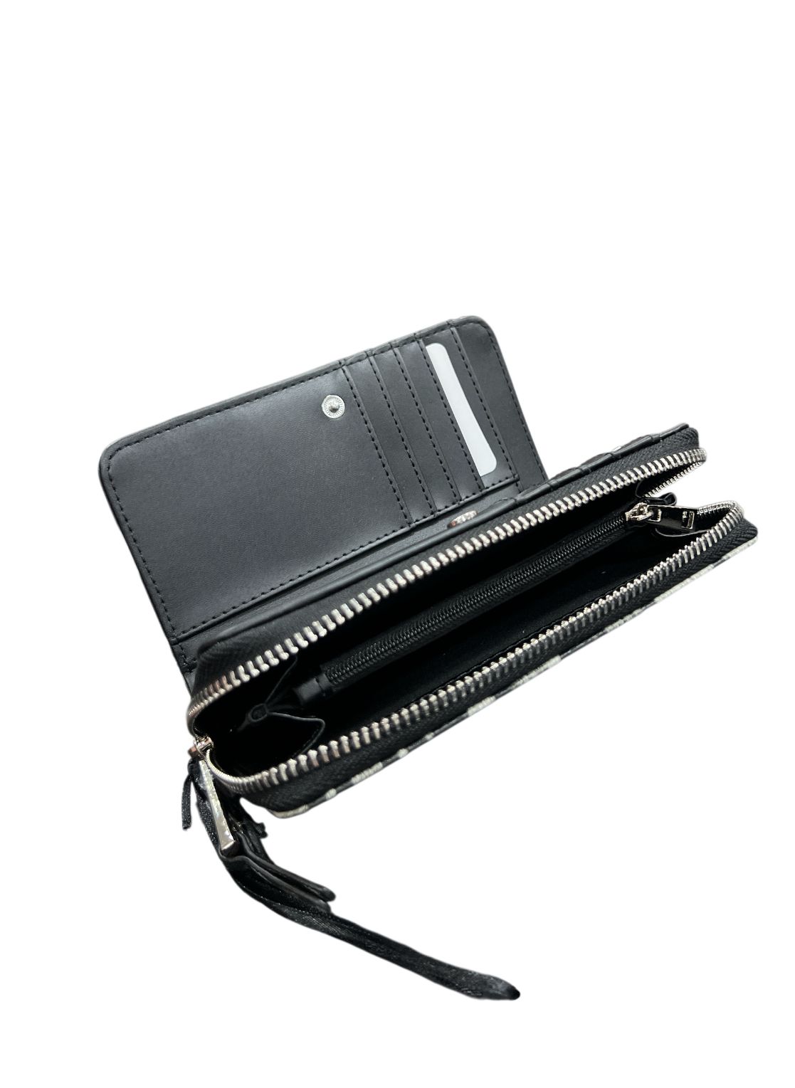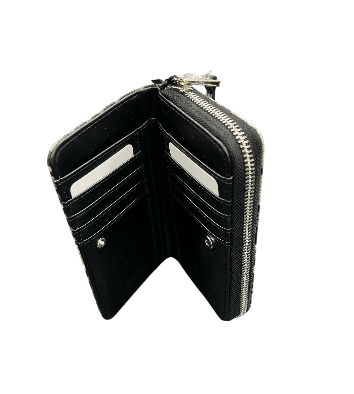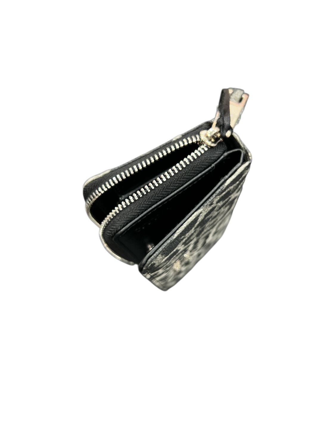 PORAFOGLIO MACULATO LOGO FRONTALE IN METALLO IN ARGENTOCHiUSURA CON BOTTONESCOMPARTI ALL'INTERNO CARTE, BANCONOTE.TASCA CON CHIUSURA ZIP PER MONETE.