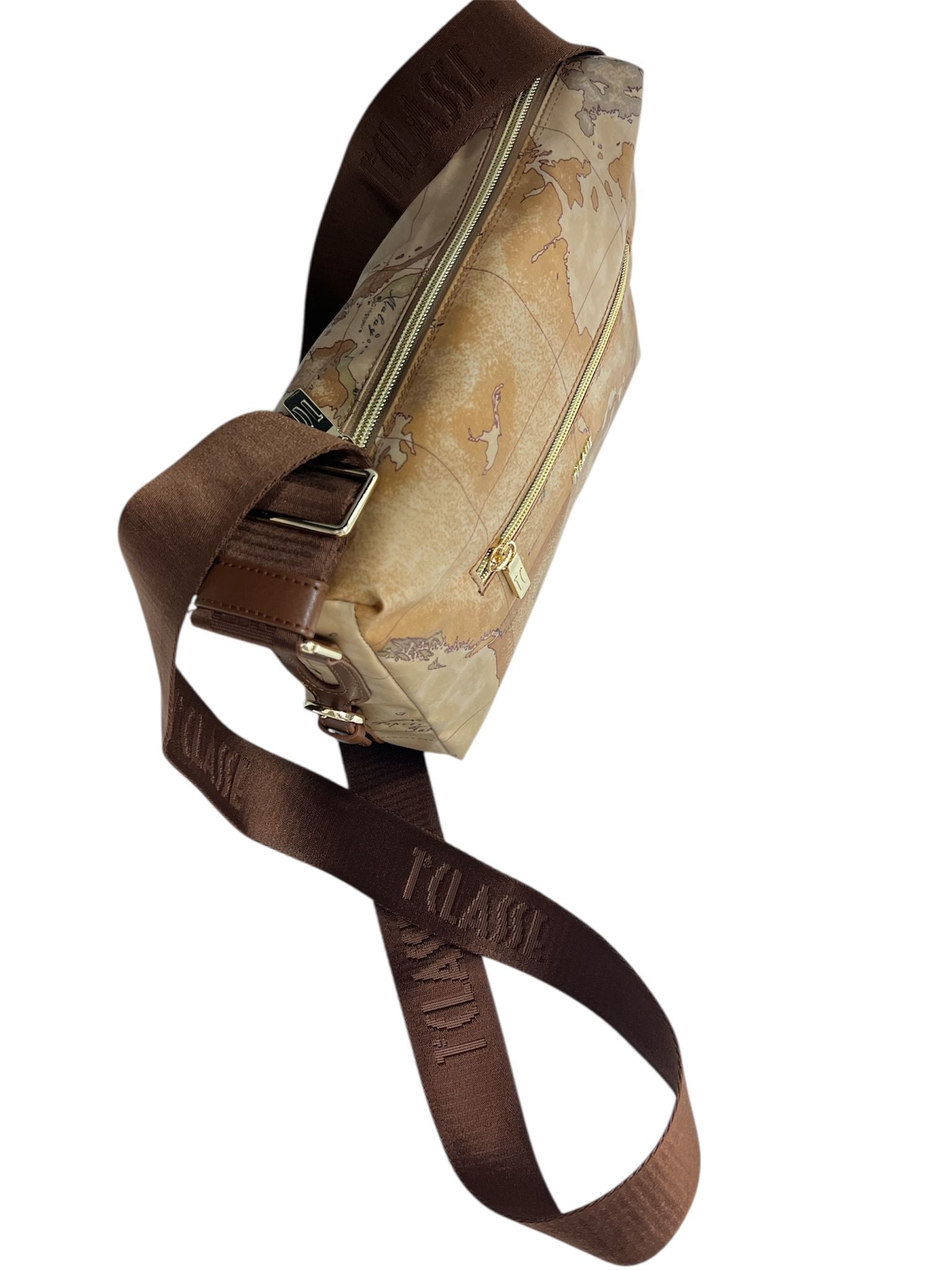 tracolla alviero martini con stampa ''geo classic'' in tessuto morbido.sulla parte frontale della borsa troviamo una tasca con zip perfetta...