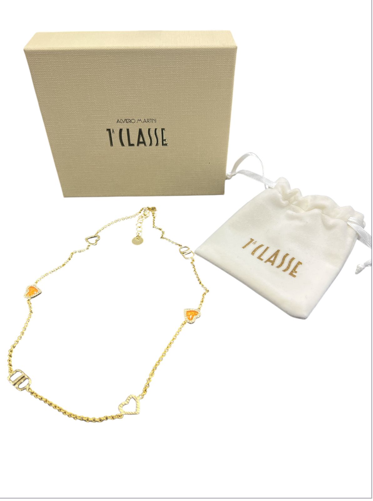 Collana alviero martini realizzata in acciaio inossidabile di colore oro .la collana presenta piccoli cuori che si alternano al logo...
