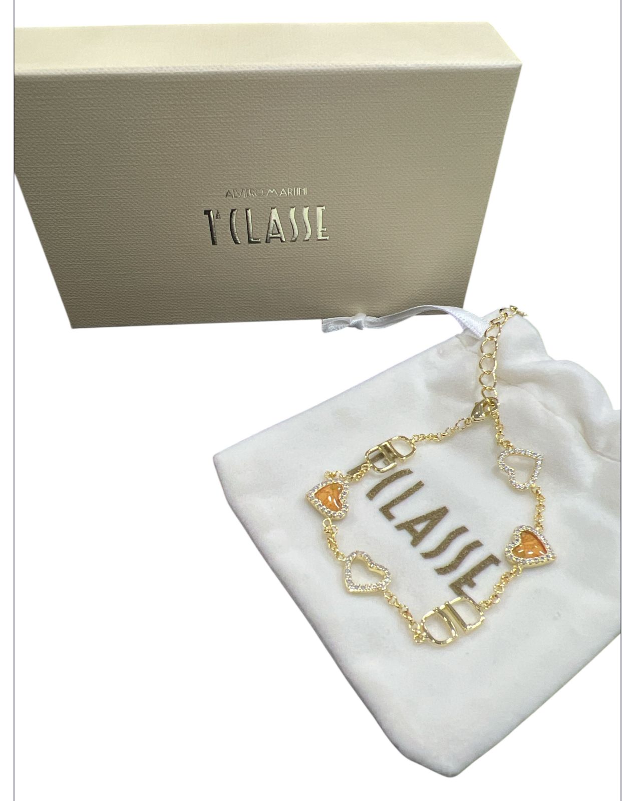 il bracciale presenta cuori traforati con brillantini e il logo 1 classe.