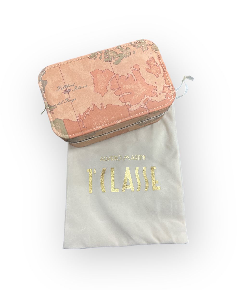 porta gioie alviero martini realizzato in ecopelle con stampa geo classic che riconduce all'iconico brand, apertura con zip dorata all'interno presenta vari scomparti per inserire anelli, collane, orecchini e bracciali.