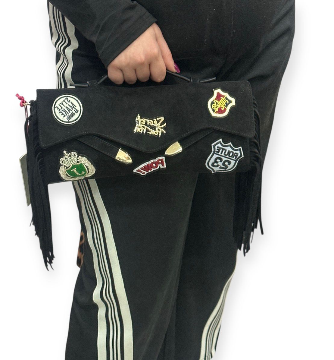 La Luisita Clutch Fringe Suede unisce eleganza e carattere grazie alle frange morbide e ai patch decorativi in pelle scamosciata. La chiusura con lucchetto garantisce sicurezza e un tocco distintivo, rendendola ideale per chi cerca un accessorio sofisticato e funzionale per occasioni speciali o serate.