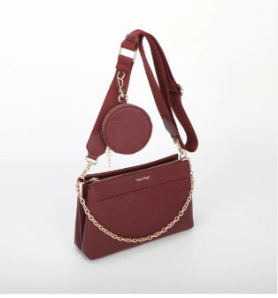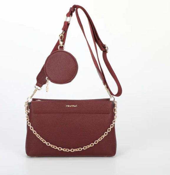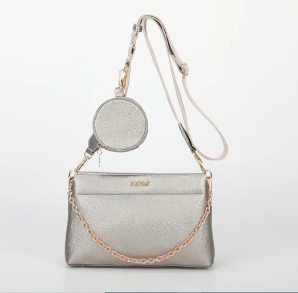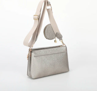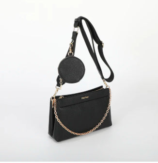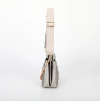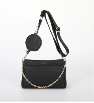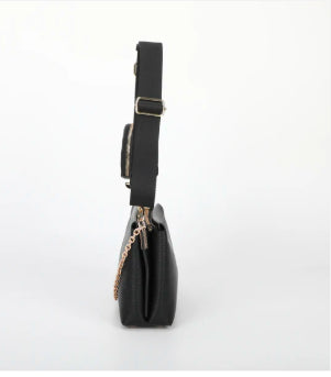 ORSA A TRACOLLA CON PORTA SPICCIOLI A MANO SPALLA E CON TRACOLLA REGOLABILE IN TESSUTO DETTAGLI IN ORO CON MANICO IN CATENA ORO CHIUSURA CON ZIP 2 VANI INTERNI UNGHEZZA: 25,5cm