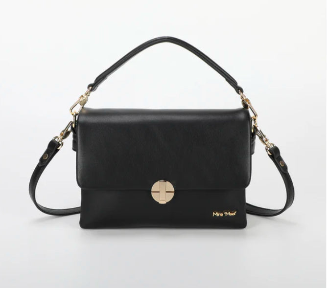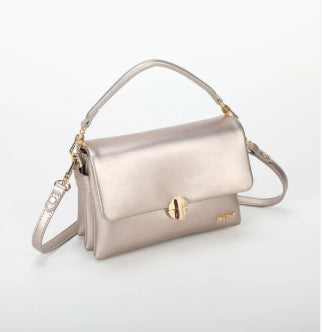 BORSA A TRACOLLA CON CHIUSURA TONDA ORO A SPALLA E CON TRACOLLA REGOLABILE IN TESSUTO DETTAGLI IN ORO CON MANICO IN PELLE CORTO CHIUSURA CON ZIP 3 VANI INTERNI DI CUI UNO CON ZIP E CON PATTA UNGHEZZA: 23cm