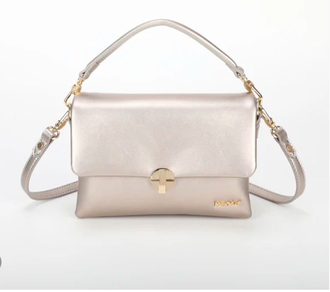 BORSA A TRACOLLA CON CHIUSURA TONDA ORO A SPALLA E CON TRACOLLA REGOLABILE IN TESSUTO DETTAGLI IN ORO CON MANICO...