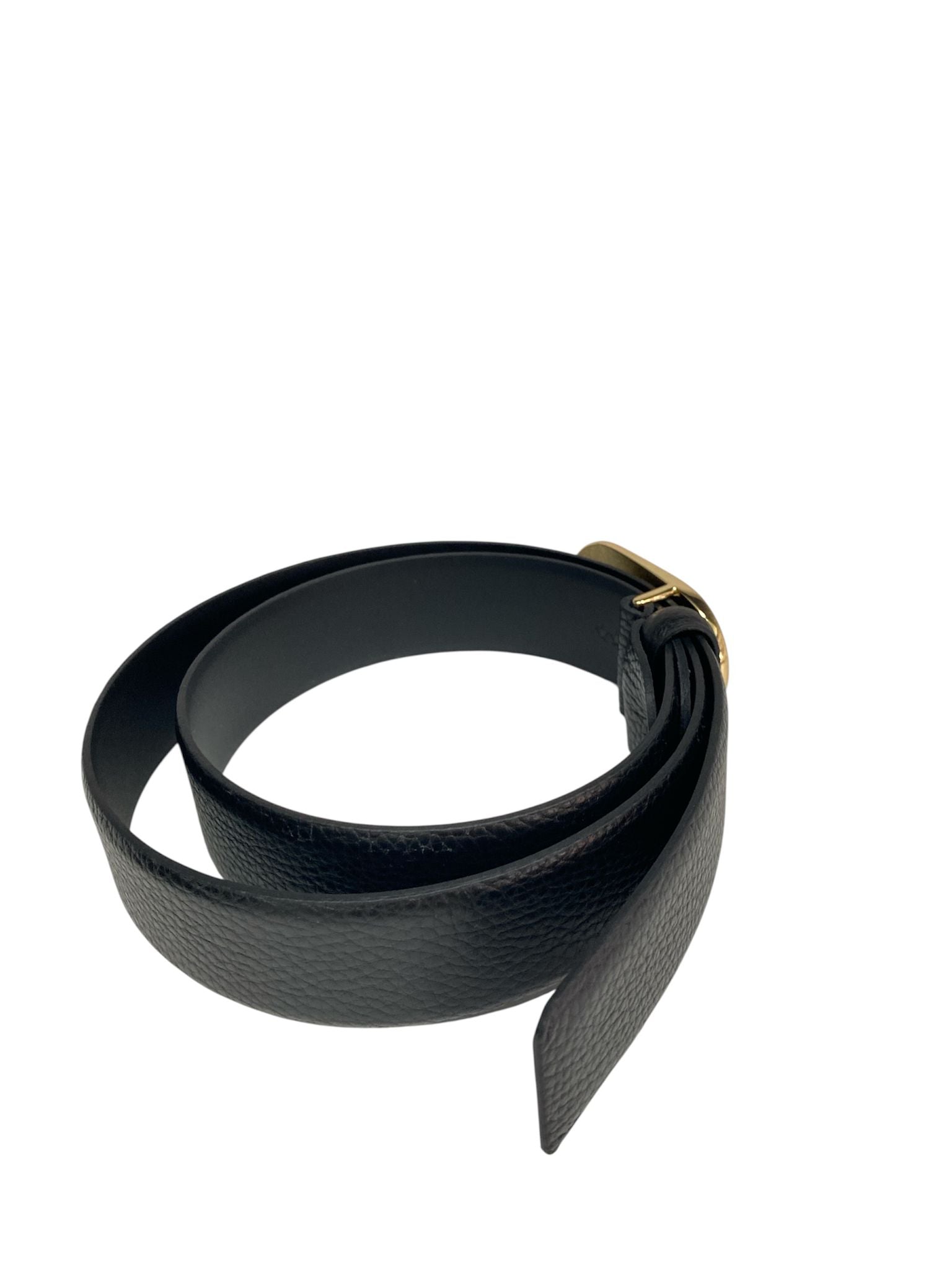 Cinta marc ellis in pelle la fibbia è di colore oro , di forma ovale ,con una grande M centrale in rilievo.
