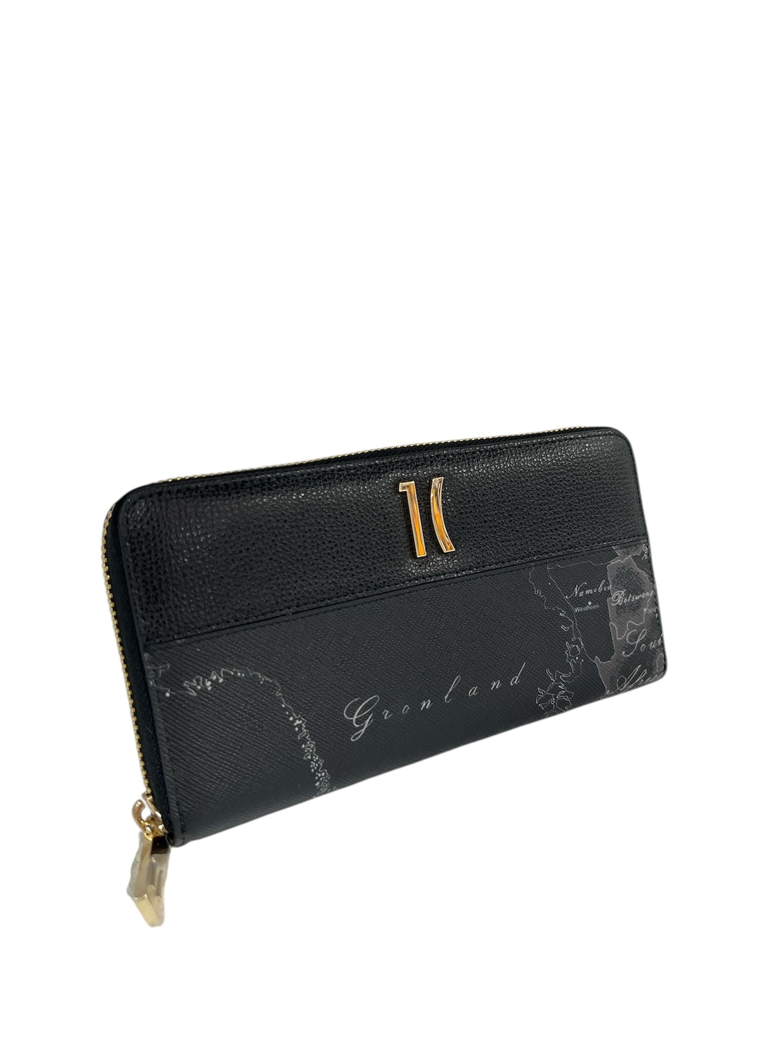 portafoglio alviero martini la parte superiore è in pelle martellata la parte inferiore ha un motivo a stampa ''geo classic''.