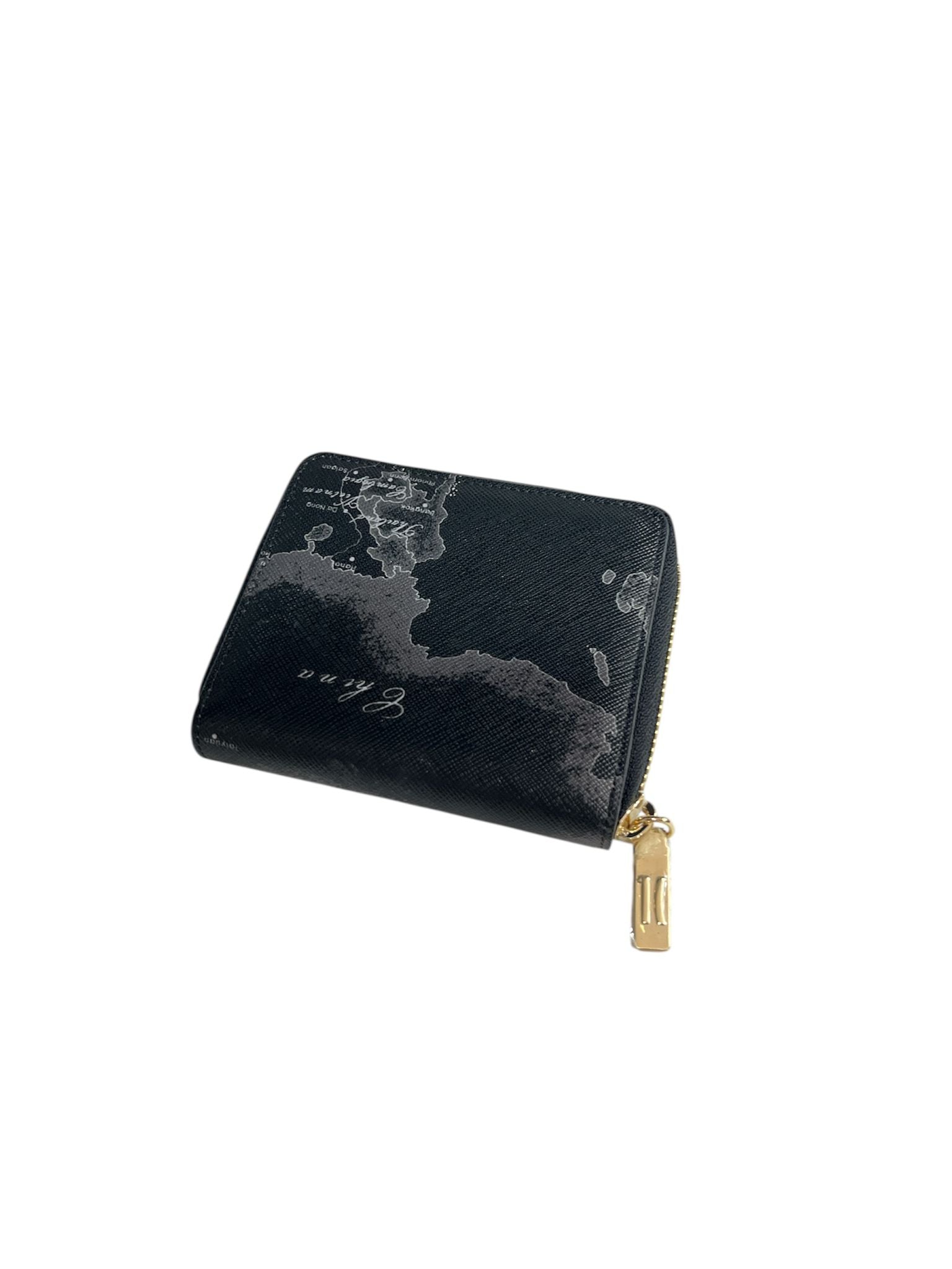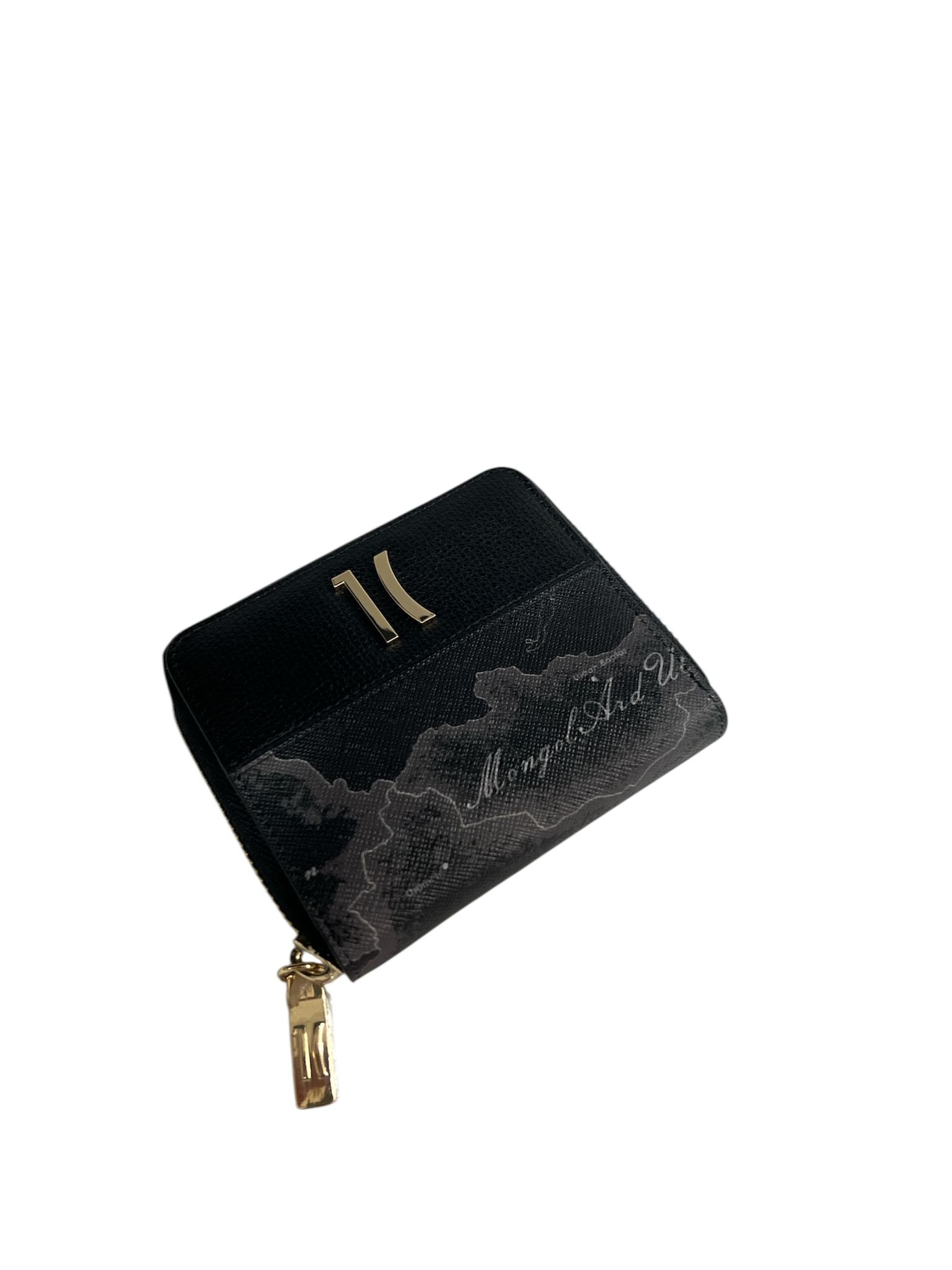 portafoglio di piccole dimensioni alviero martini la parte superiore è in pelle martellata la parte inferiore ha un motivo a stampa ''geo classic''.