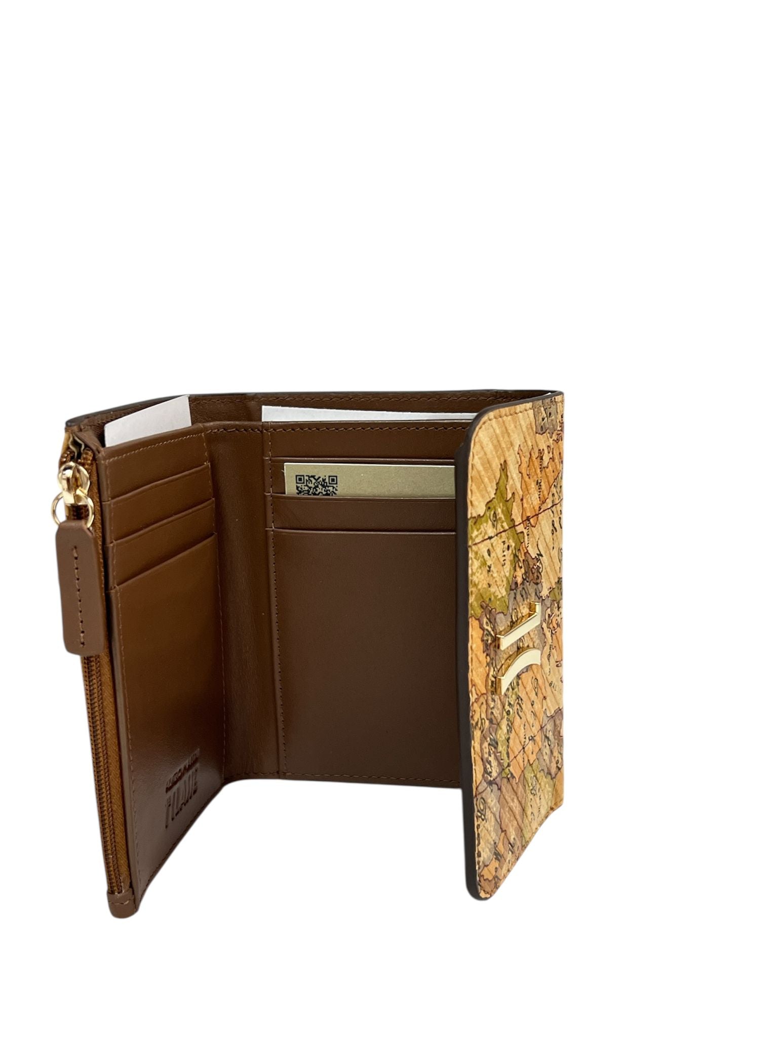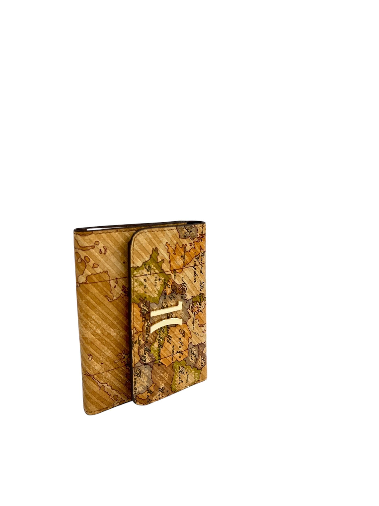 portafoglio alviero martini con stampa a mappa geografica vintage tipica di alviero martinial centro c'è il logo metallico dorato a...