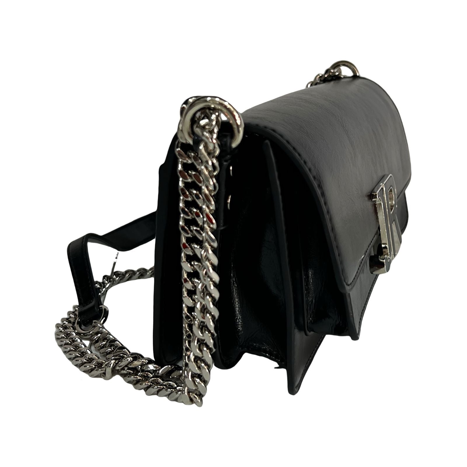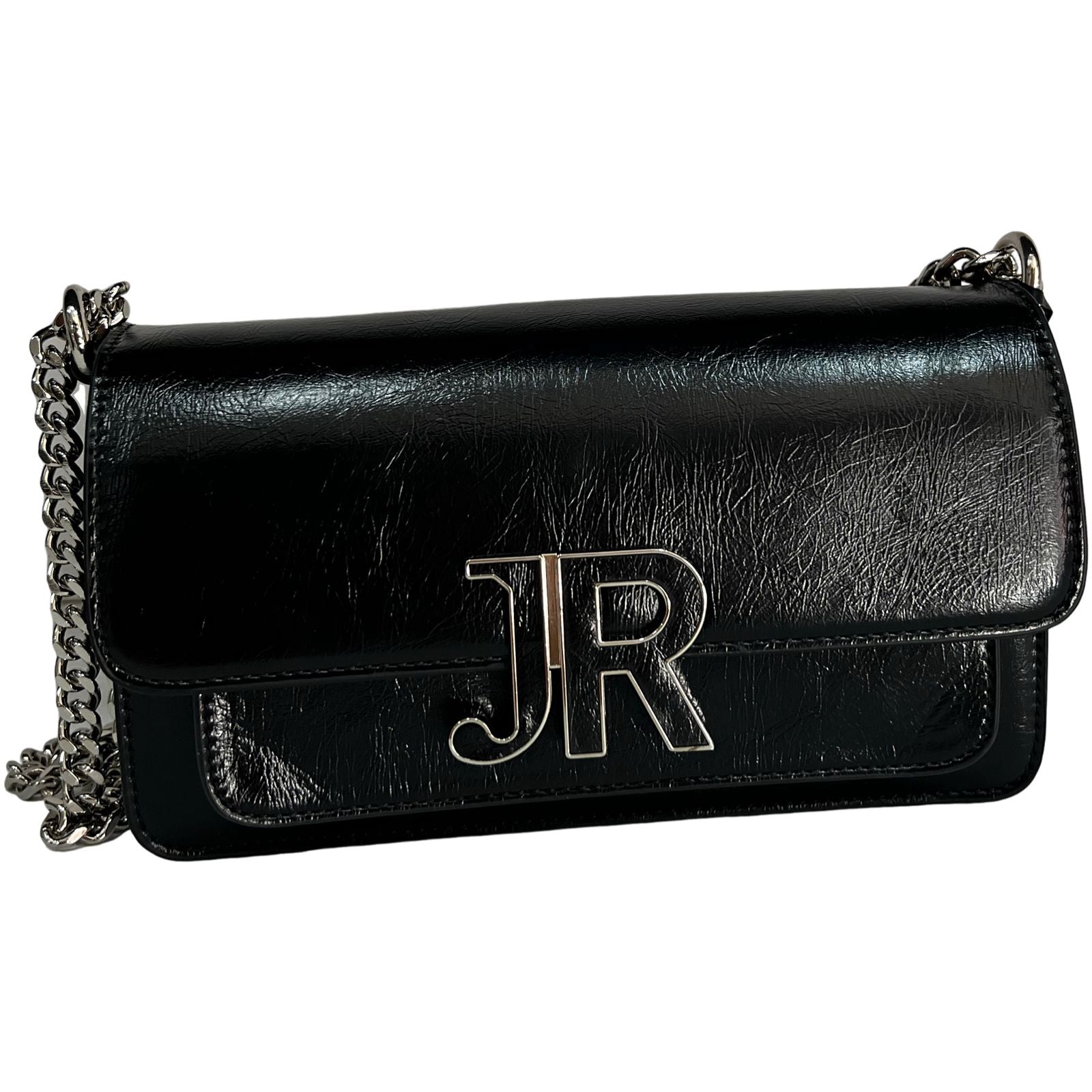 borsa john richmond a tracolla realizzata in ecopelle con finitura liscia e lucida, di forma rettangolare con chiusura a patta sulla parte frontale della borsa presenta il logo metallico ''JR'' elemento distintivo del brand.