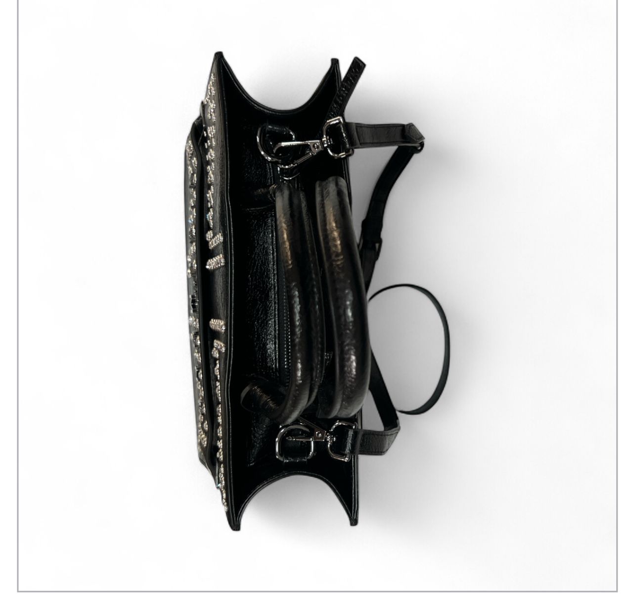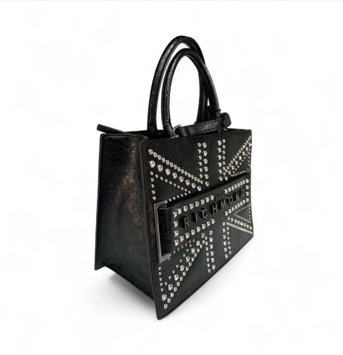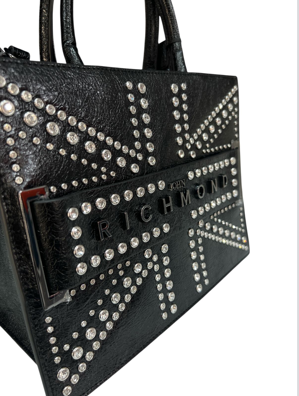 Borsa richmond realizzata in ecopelle martellata con una texture leggermente rugosa, sulla parte frontale spicca un motivo geometrico realizzato con borchie e strass argentate che richiama la bandiera britannica.