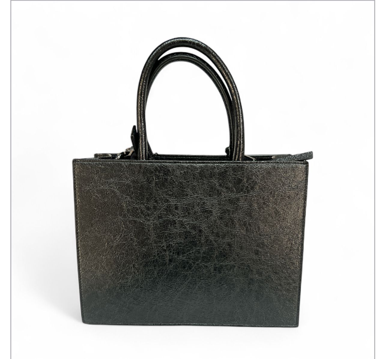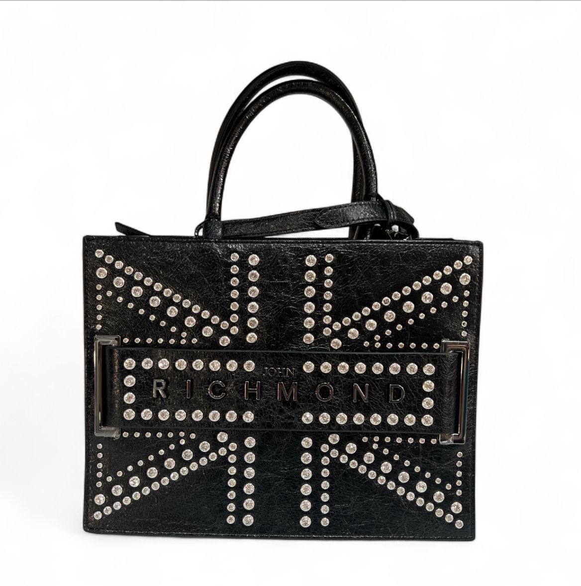 al centro, inserito in un rettangolo in rilievo con cornice nera c'è la scritta ''john richmond'' manici corti doppi per portarla a mano e due tracolle regolabili.