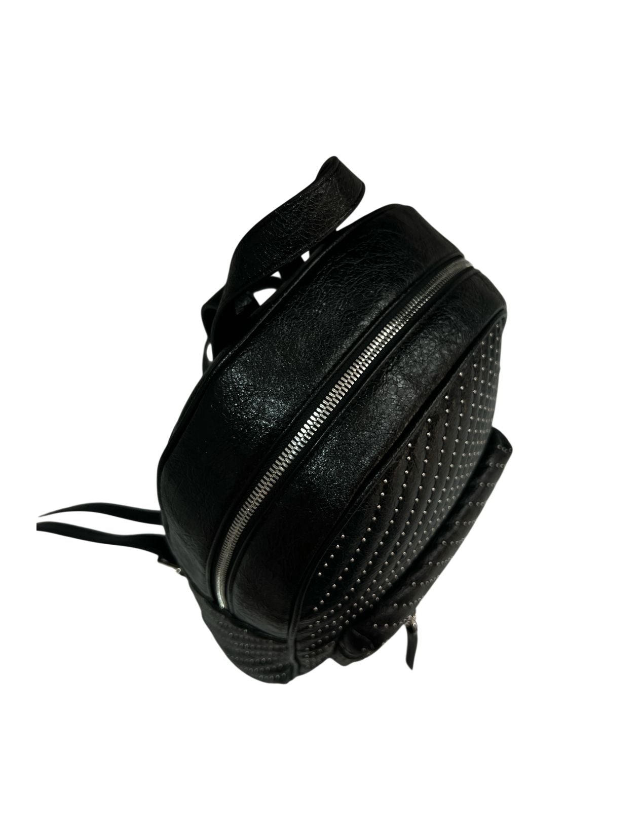 la superficie è impreziosita da piccole borchie metalliche argentate disposte ordinatamente che creano un effetto luminoso e raffinato.