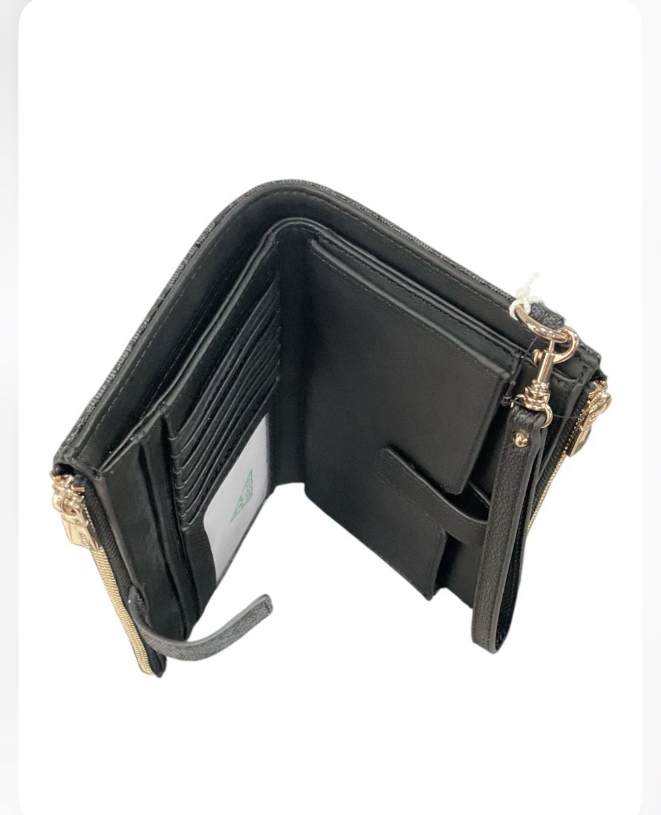 All’interno, ogni dettaglio è studiato per semplificarti la vita: uno scomparto per banconote, sette vani per carte e una tasca con zip per le monete ti permettono di avere tutto in ordine, senza rinunciare alla raffinatezza. Il cinturino da polso removibile aggiunge versatilità, trasformando questo portafoglio in un accessorio comodo da portare ovunque.