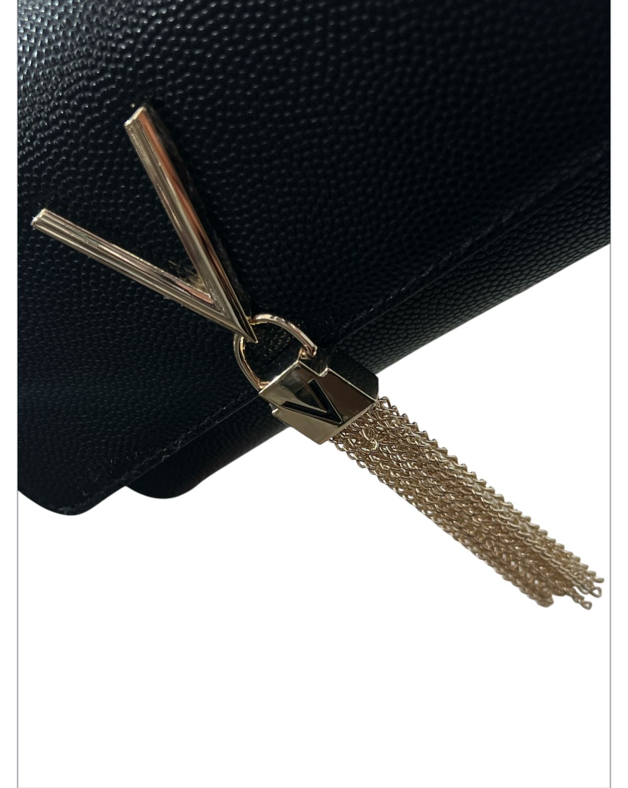 la particolarità della borsa è presente nella parte frontale dove troviamo uno charm con la ''v''che riprende il logo del brand con nappe che scendono
