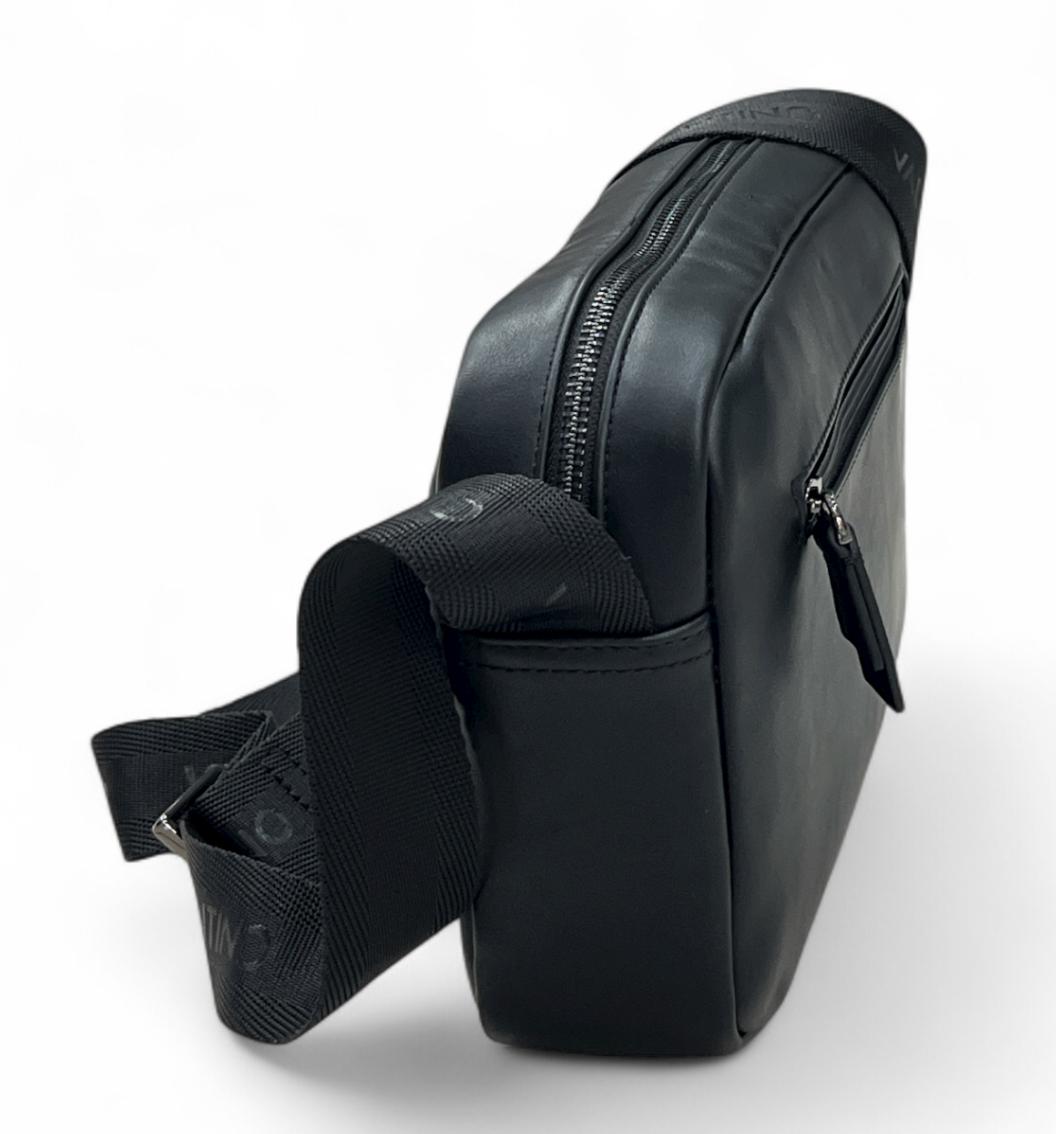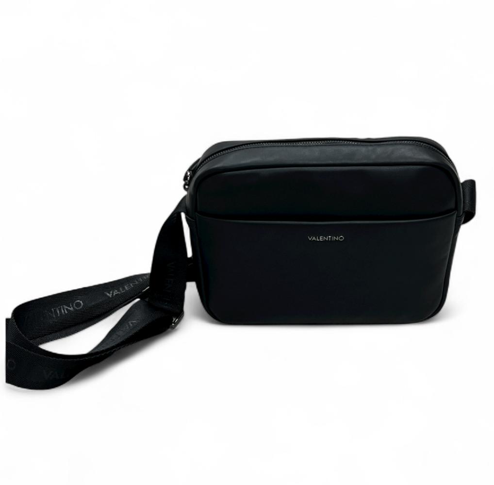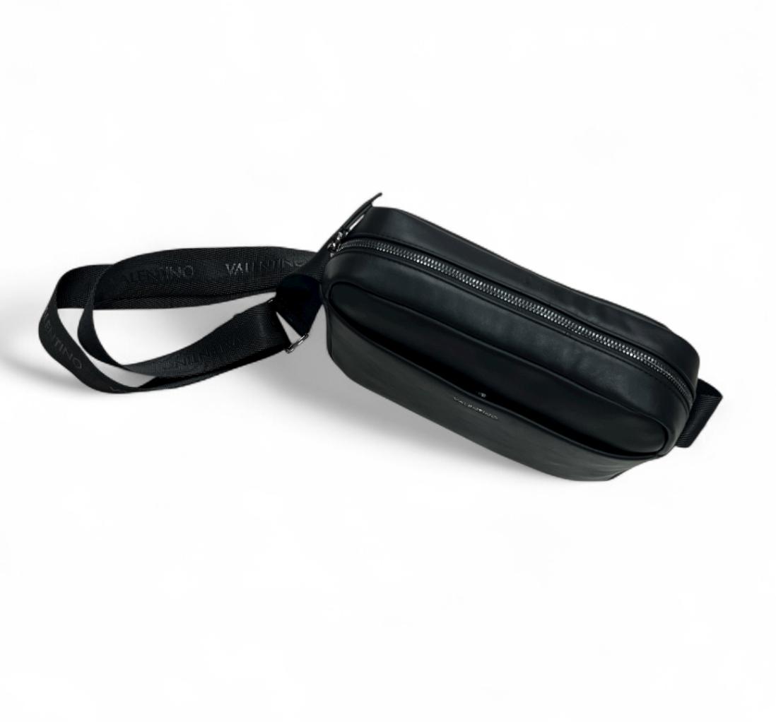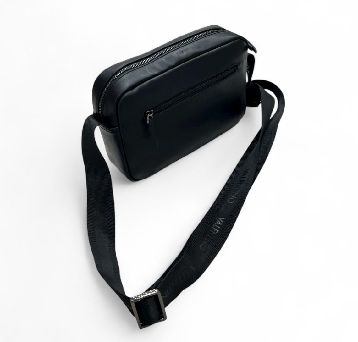 La tracolla è in tessuto tecnico resistente, di colore nero anch’essa, e riporta la scritta “VALENTINO” ripetuta in tono leggermente più chiaro, creando un effetto tono su tono molto raffinato. La lunghezza è regolabile, così da poterlo indossare sia a tracolla che a spalla.