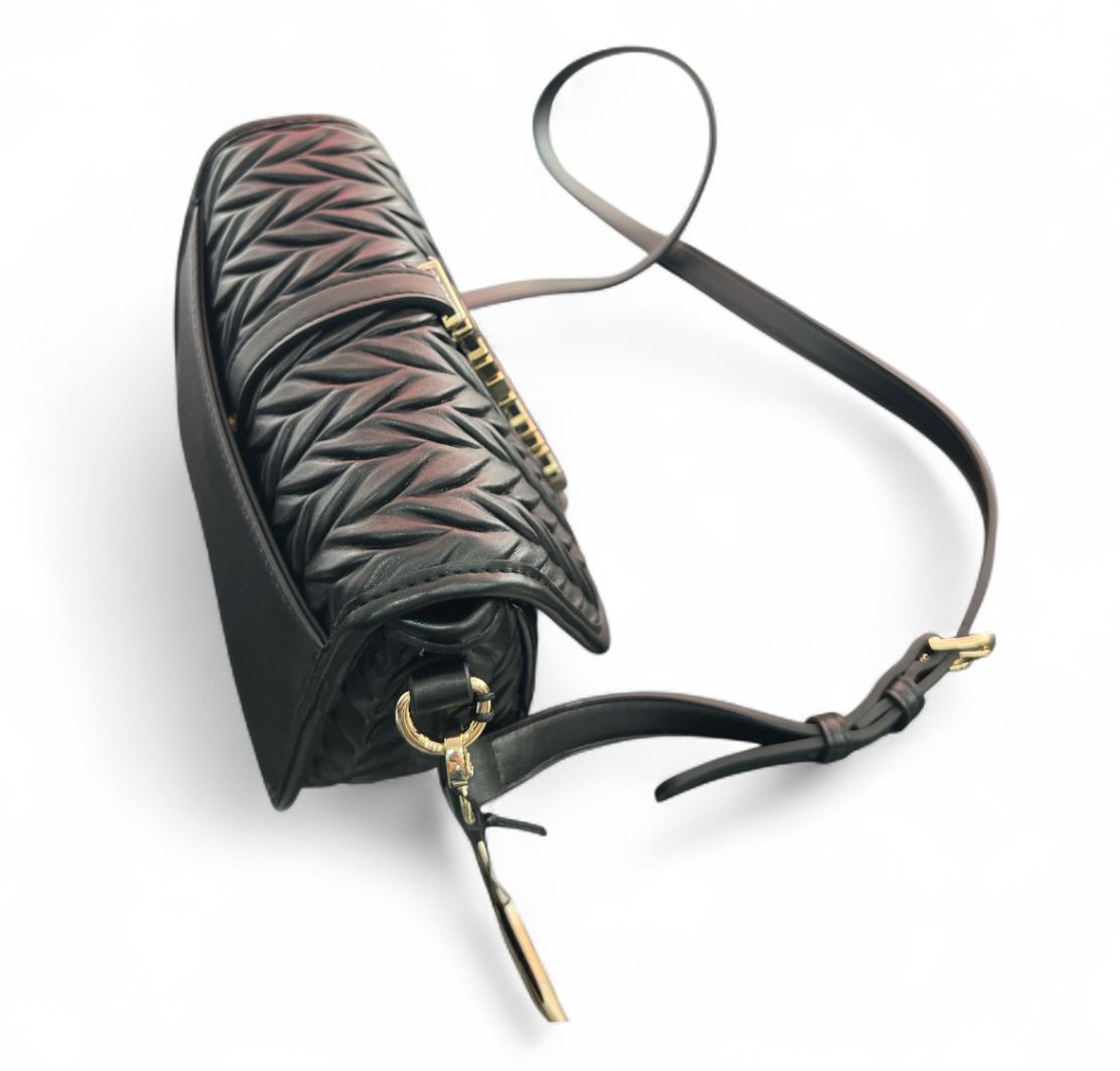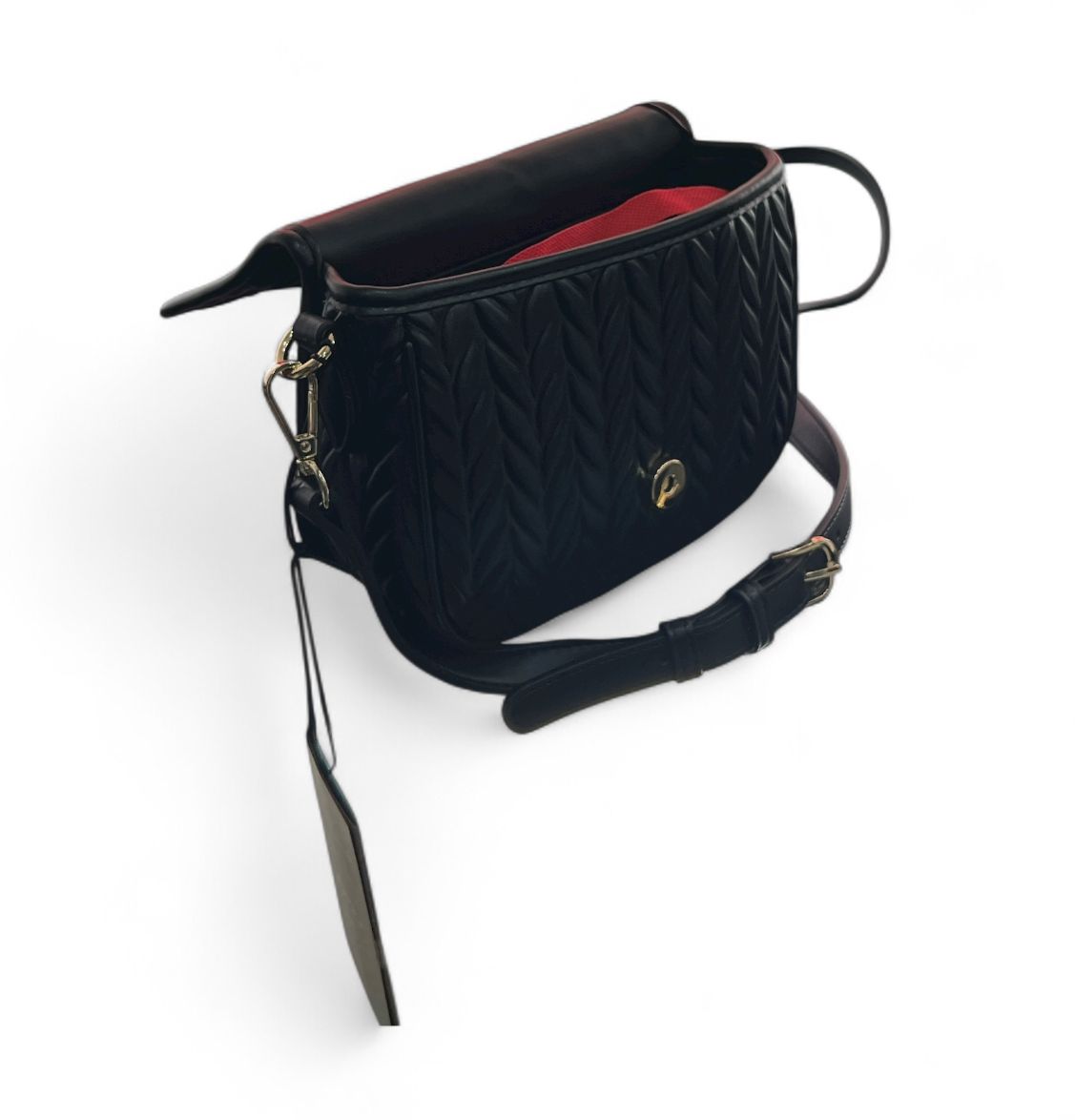 Pattina dalla finitura goffrata, con logo di metallo, dorato, che si poggia sul davanti in verticale.