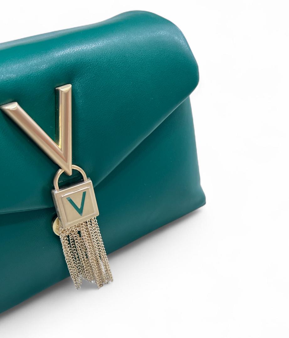 apertura con bottoncino e dettaglio charm nella parte centrale presenta in caratteri grandi in metallo dorato la 'v' con lucchetto che riconduce al logo del brand