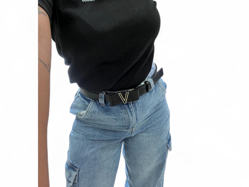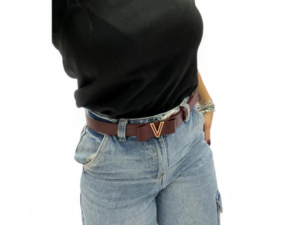 particolarità della fibbia che presenta la ''V'' che riconduce al brand in metallo contornato da un fiocco in ecopelle