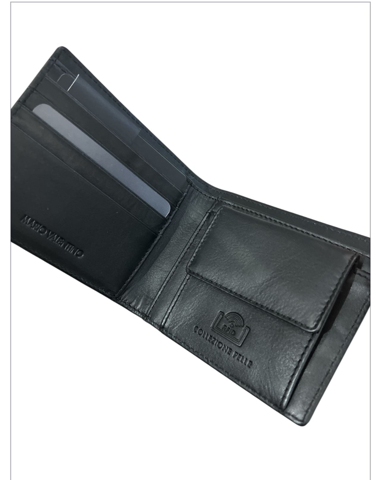 all'interno troviamo vari scomparti per carte scomparto per banconote e scomparto con bottoncino per monete