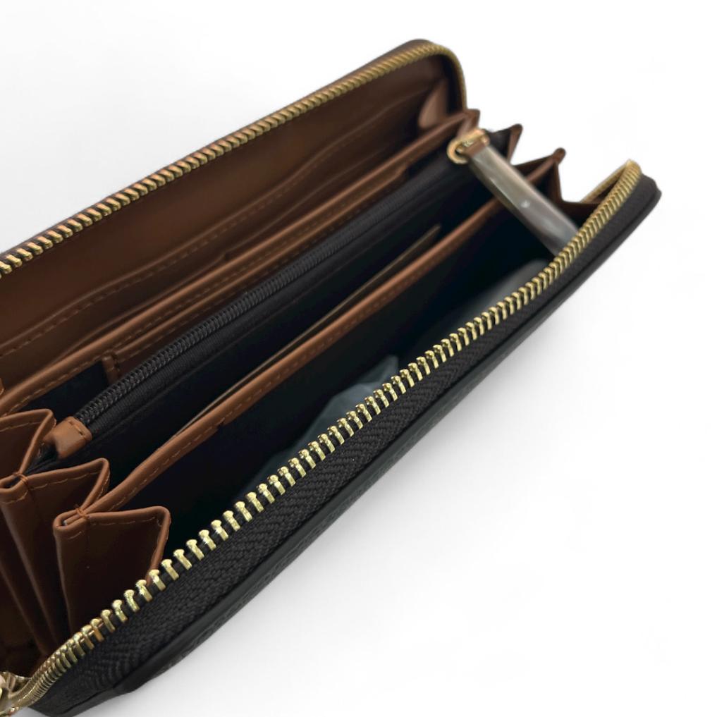 All'interno comprende scomparti porta carte, porta monete,banconote