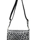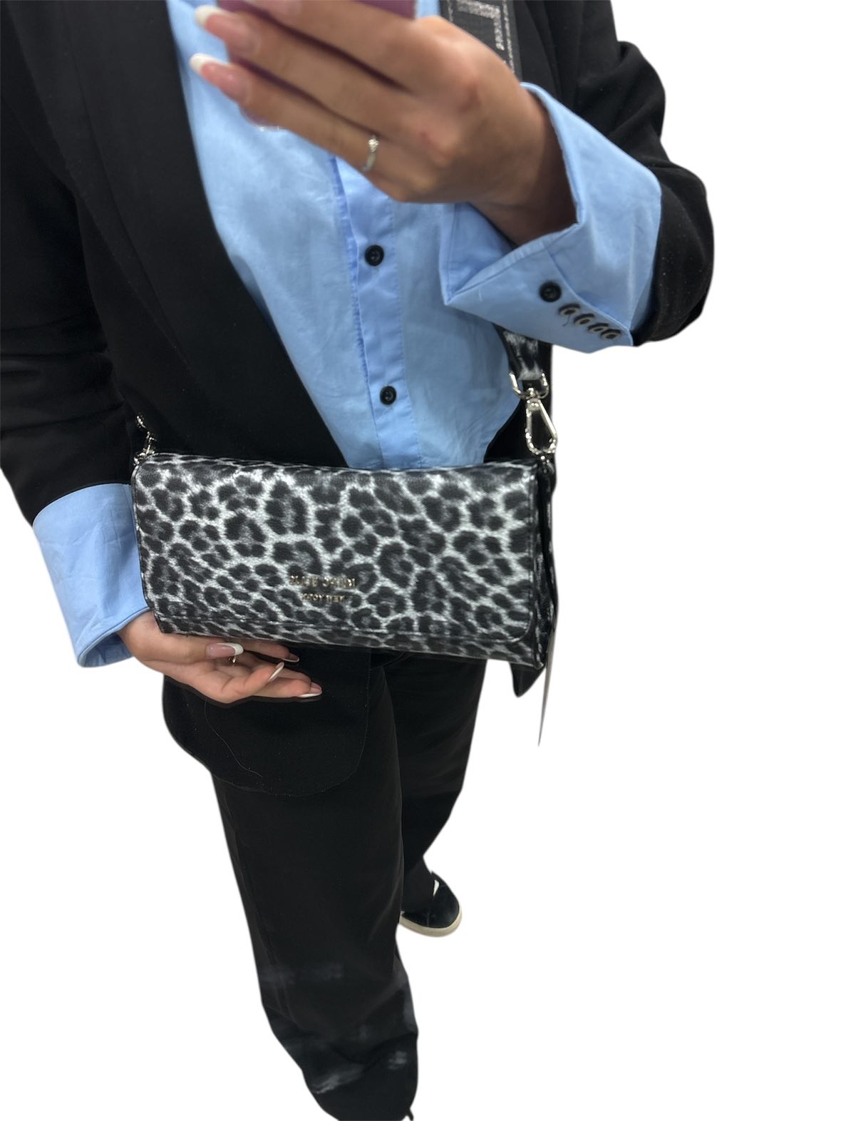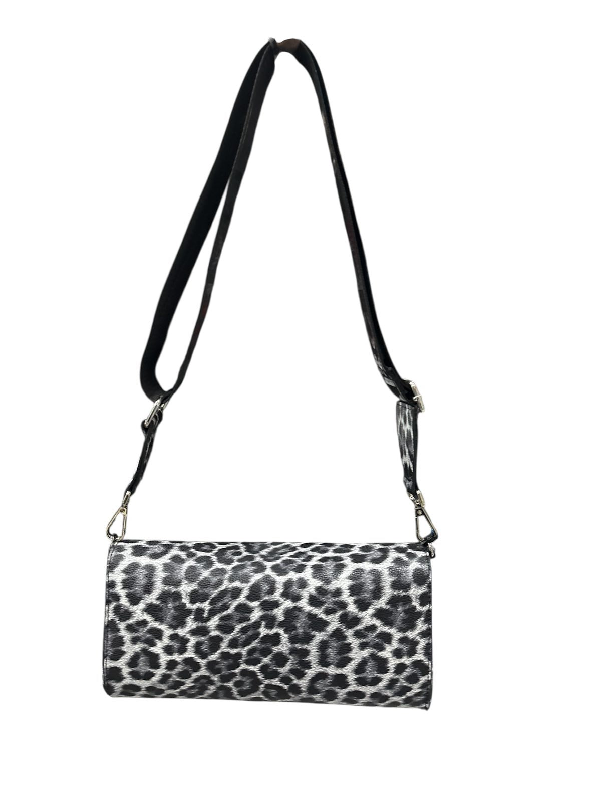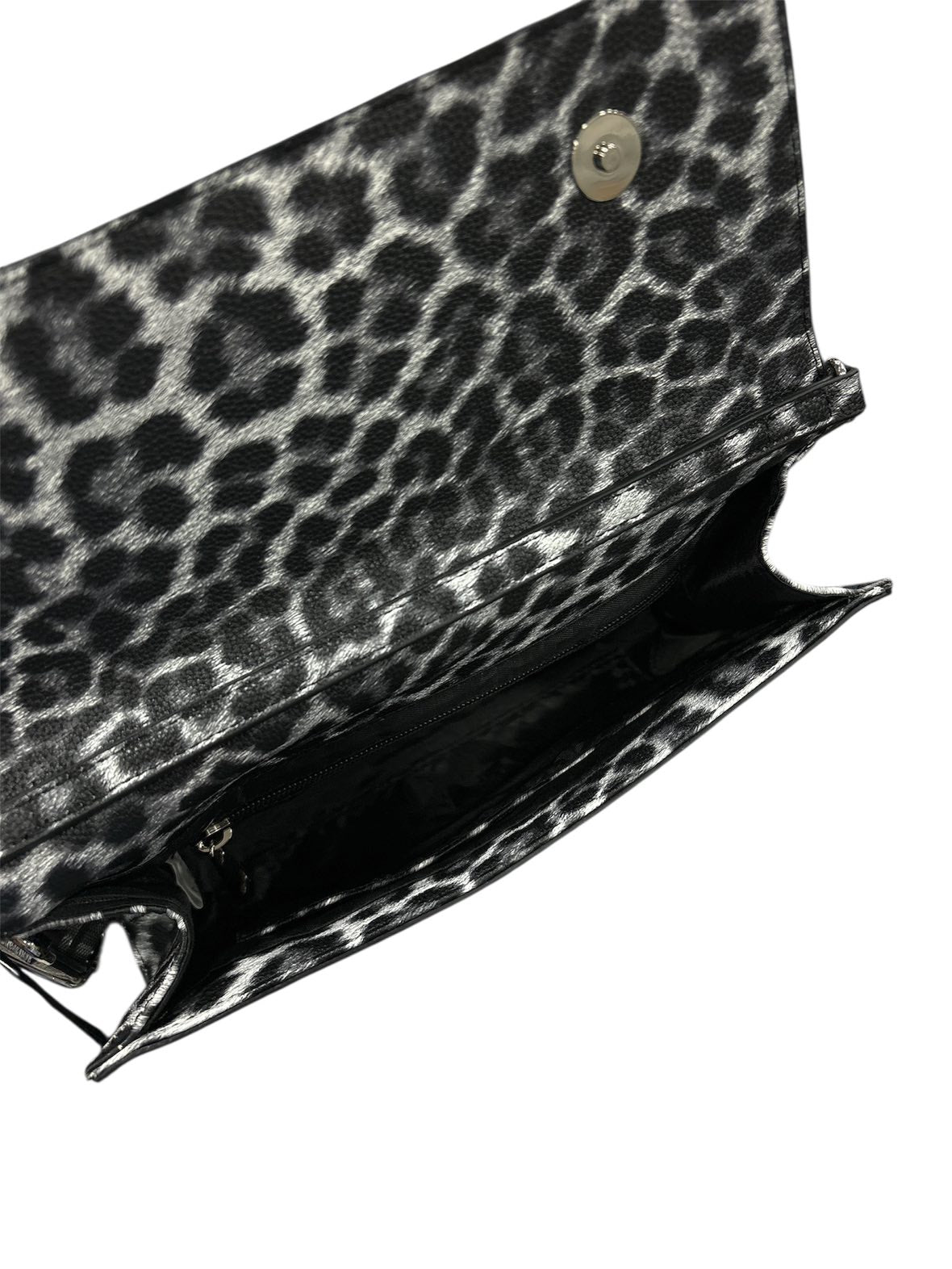 Pochette fantasia leopardata, chiusura magnetica, tracolla in stoffa regolabile e removibile. Tasca interna con zip. Dimensioni: 26 x 13 x 5 cm.
