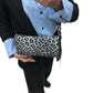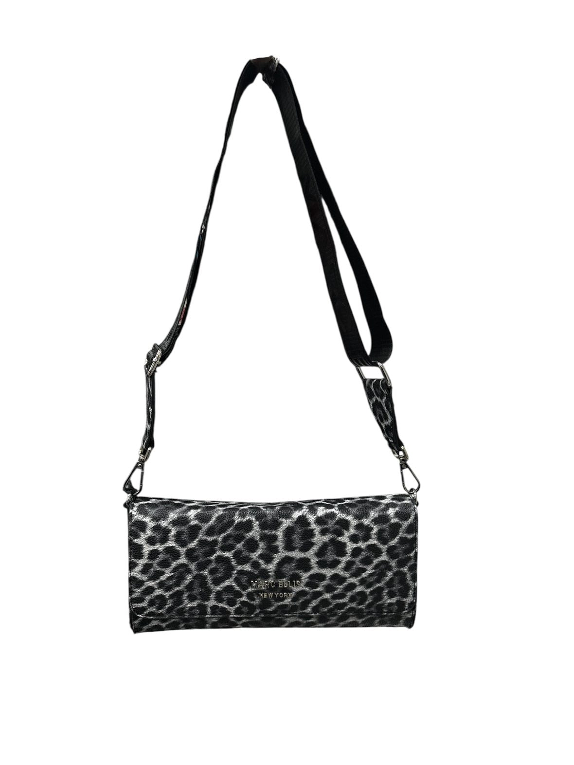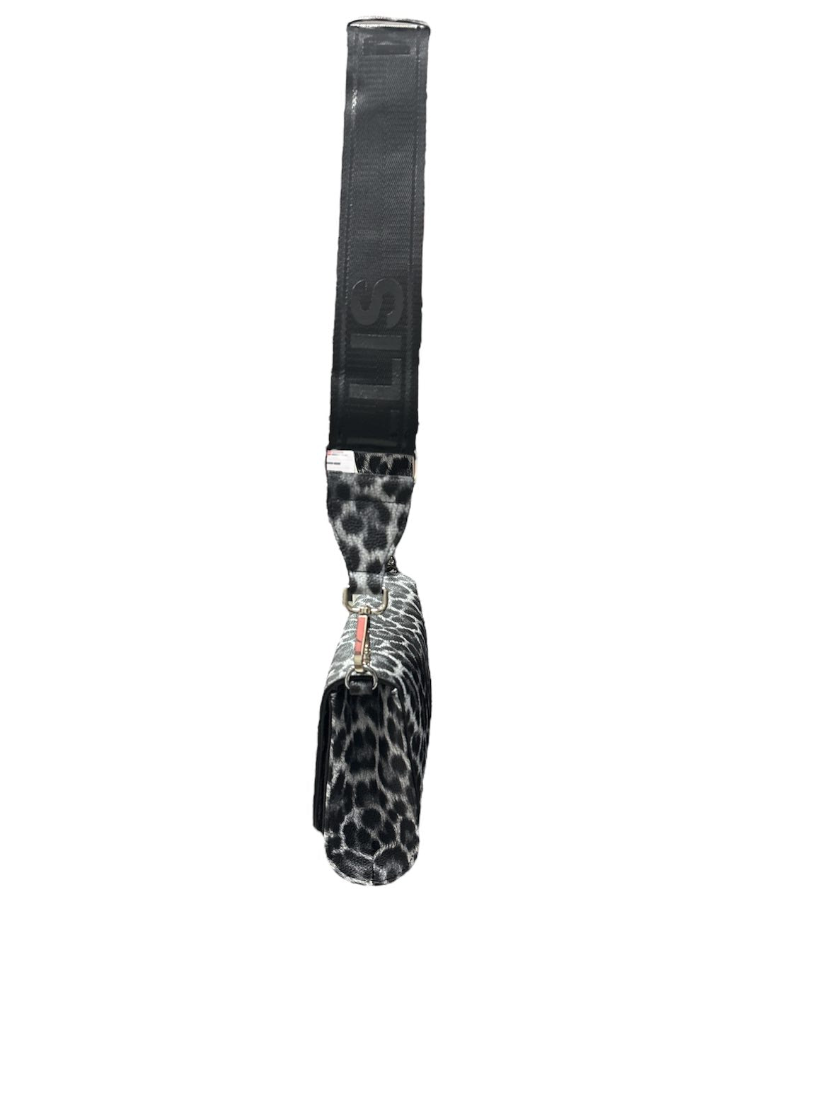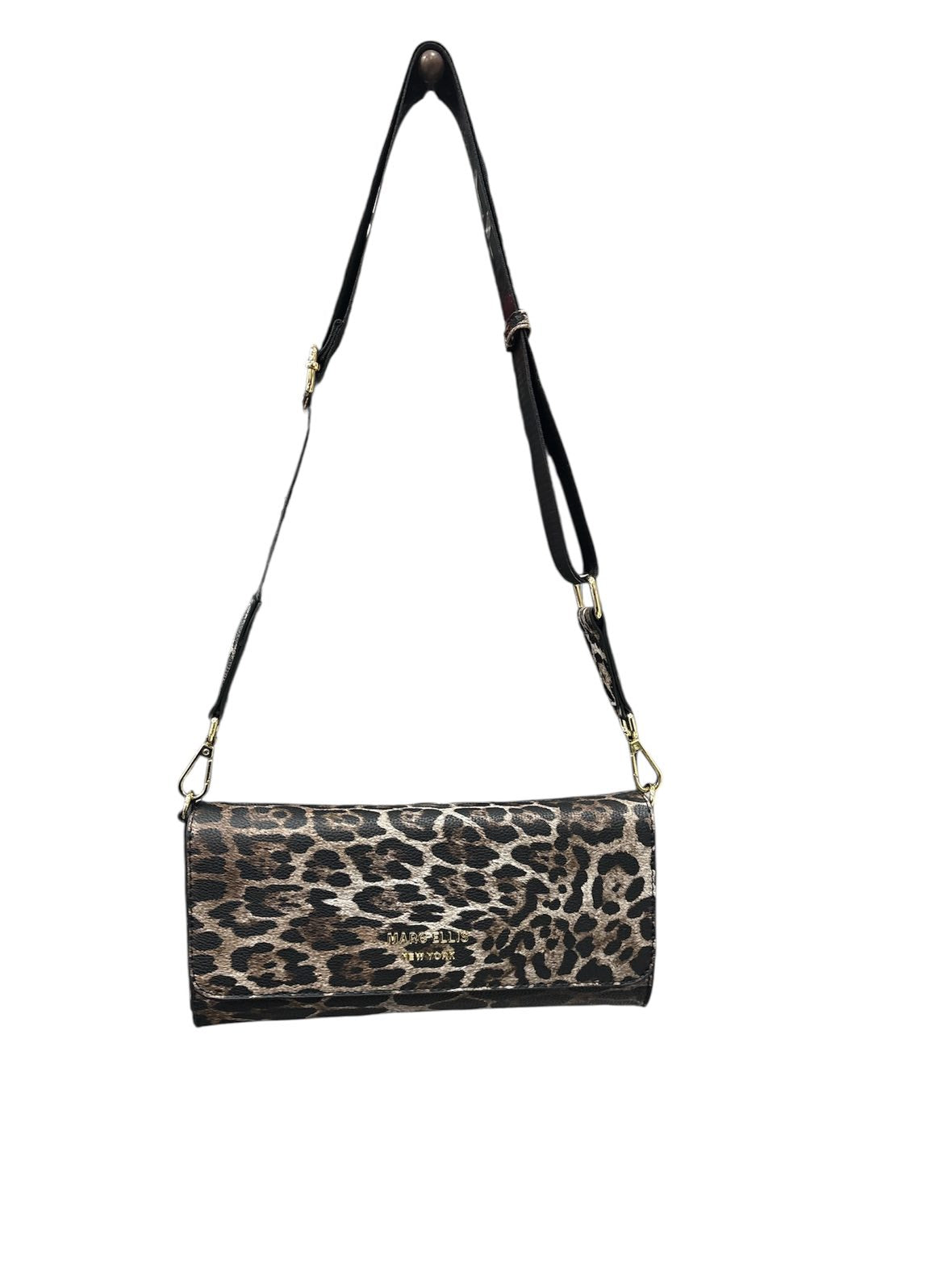 Pochette fantasia leopardata, chiusura magnetica, tracolla in stoffa regolabile e removibile. Tasca interna con zip. Dimensioni: 26 x 13 x 5 cm.